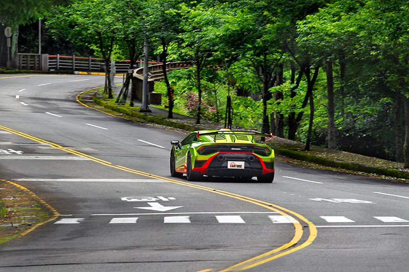 Huracan STO提供STO、Trofeo、Pioggia三種駕駛模式,其中STO輸出力道已和Huracan EVO Sport模式相同甚至接近Corsa模式。 果不其然屬正常狀態的STO模式,只輕踩油門就感受到擁有更加強勁的加速反應,蠢蠢欲動蓄勢待發的衝勁已和Huracan EVO Sport模式相同甚至接近Corsa模式,而在耳邊環繞的響亮高亢排氣聲浪,則像似不斷鼓催你進一步加深油門,好讓它得以獲得釋放舒壓。當然在此氛圍下很難定下心不為所動,因此右腳不爭氣的對油門施壓,過程中更切換至Trofeo模式,與方才相比動力輸出時機進一步提前,所釋放的能量也放大數倍。也因如此內心理智則告誡自己切勿激烈操駕,畢竟可是駕駛著一輛要價兩千萬的超跑,絕不容許有任何閃失,但只要不要粗暴胡亂踩踏油門,層層快速堆疊的輸出個性,縱使過程有強大能量不斷湧現,但整體依舊穩定好駕馭。