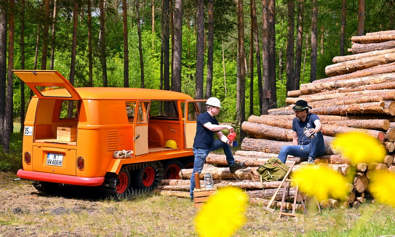這部特製的Volkswagen T1是專為特殊地形所設計,採用輪胎搭配履帶的四軸驅動形式,前面四輪是傳統的14吋胎圈,後面則採用鏈條驅動的13吋履帶系統,其中履帶是由橡膠材質製成以確保能在一般道路上合法行駛,另外這部車還搭載有LSD系統讓它在雪地環境也能保有優異的行駛能力;動力則沿用原本的1.2升四缸自然進氣引擎,僅33匹馬力只能讓極速達到35 km/h。