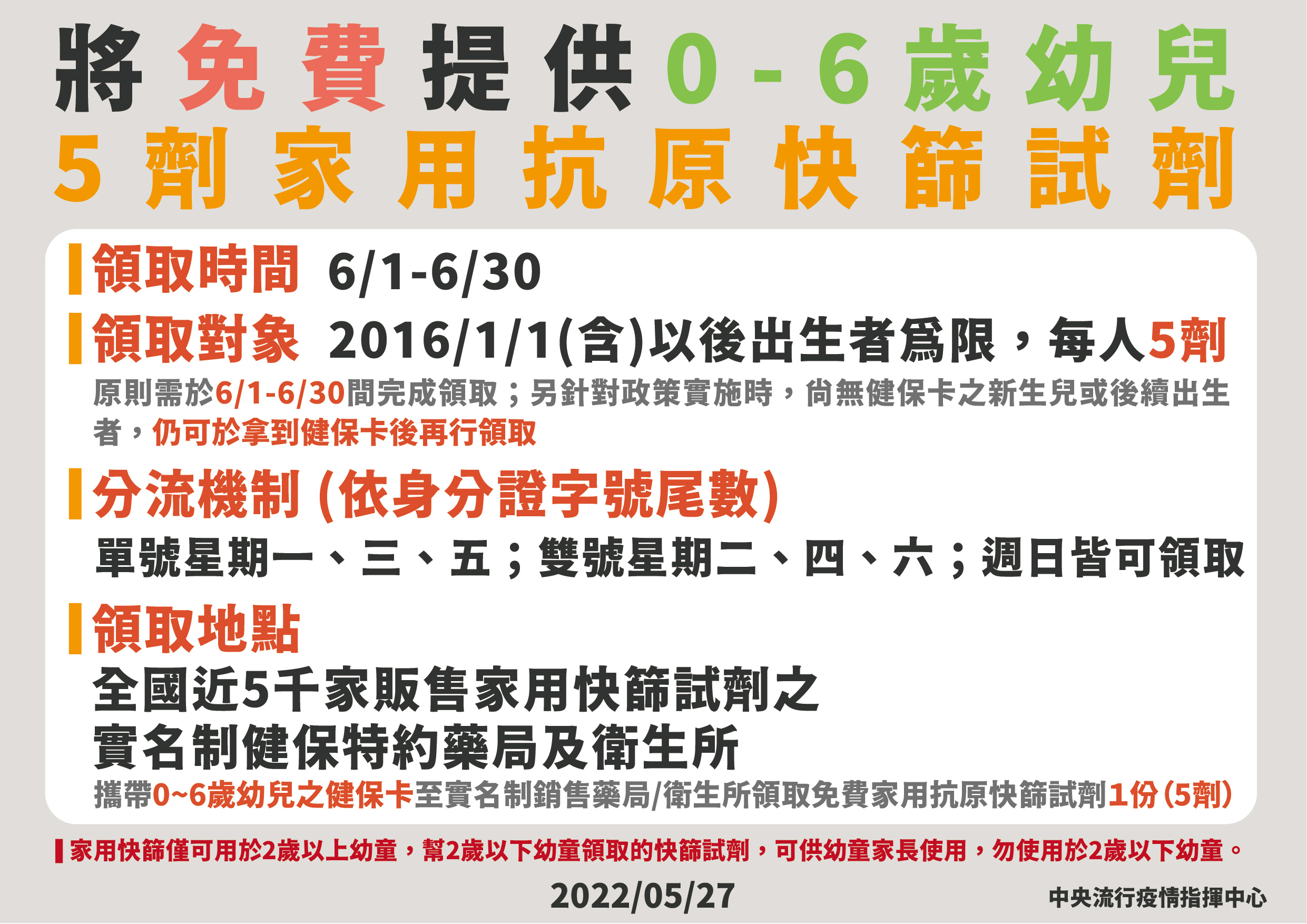 陳時中說明,0-6歲幼兒免費領取5劑家用抗原快篩試劑,預計將於今(2022)年6月1日實施,領取期限為6月30日。且此免費領取份數,不會計算入實名制第一輪(4月28日起)的購買資格。亦即曾經購買過實名制快篩的孩童父母,仍可再免費領取一次快篩試劑。另針對政策實施時,尚無健保卡之新生兒或後續出生者,仍可於拿到健保卡後再行領取。領取地點為全國近5千家販售家用快篩試劑之實名制健保特約藥局及衛生所。