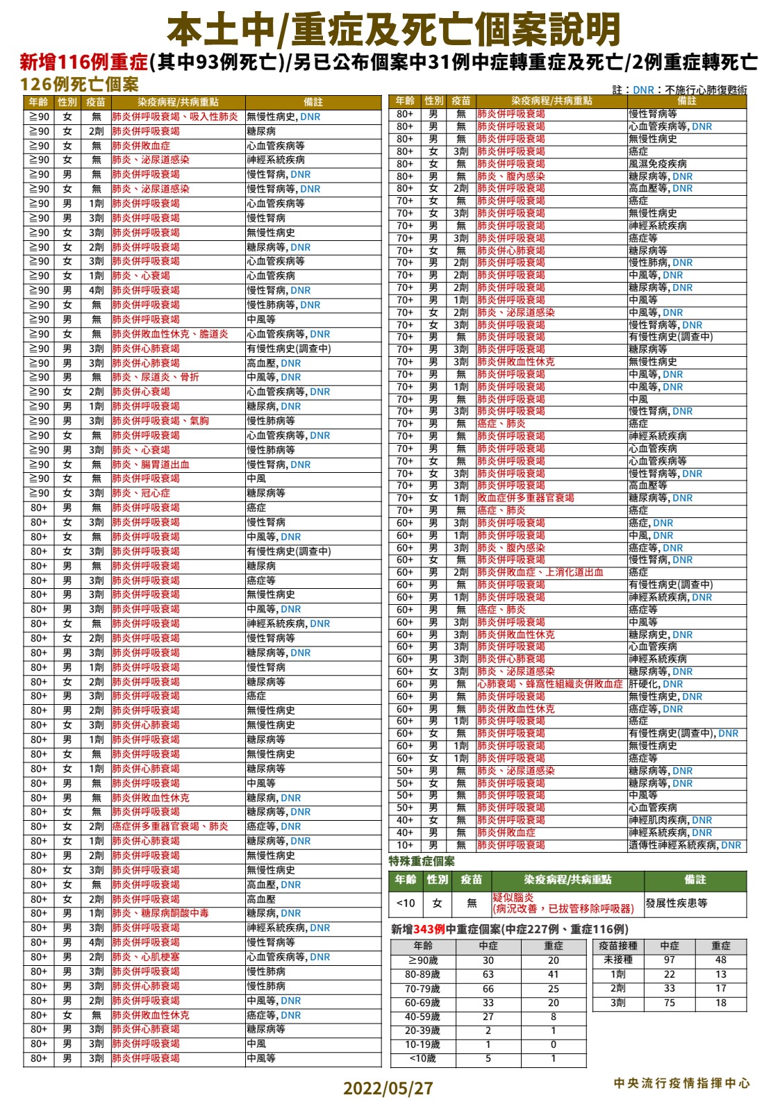 指揮中心指出,今日新增126例本土病例死亡個案,為77例男性、49例女性,年齡介於10多歲至90歲以上,皆屬重度感染個案、113例具慢性病史、52例無疫苗接種。確診日介於今(2022)年4月30日至5月21日,死亡日期介於5月16日至5月24日。
