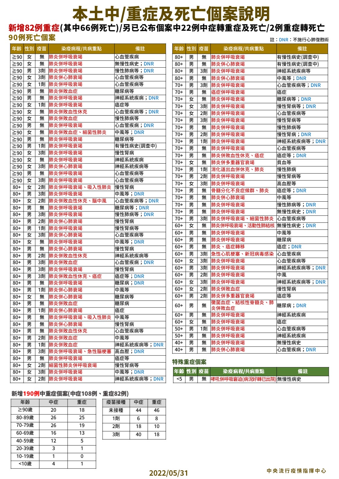 指揮中心指出,今日新增90例本土病例死亡個案,為60例男性、30例女性,年齡介於40多歲至90歲以上,皆屬重度感染個案、86例具慢性病史、44例無疫苗接種。確診日介於今(2022)年5月2日至5月28日,死亡日期介於5月11日至5月29日。