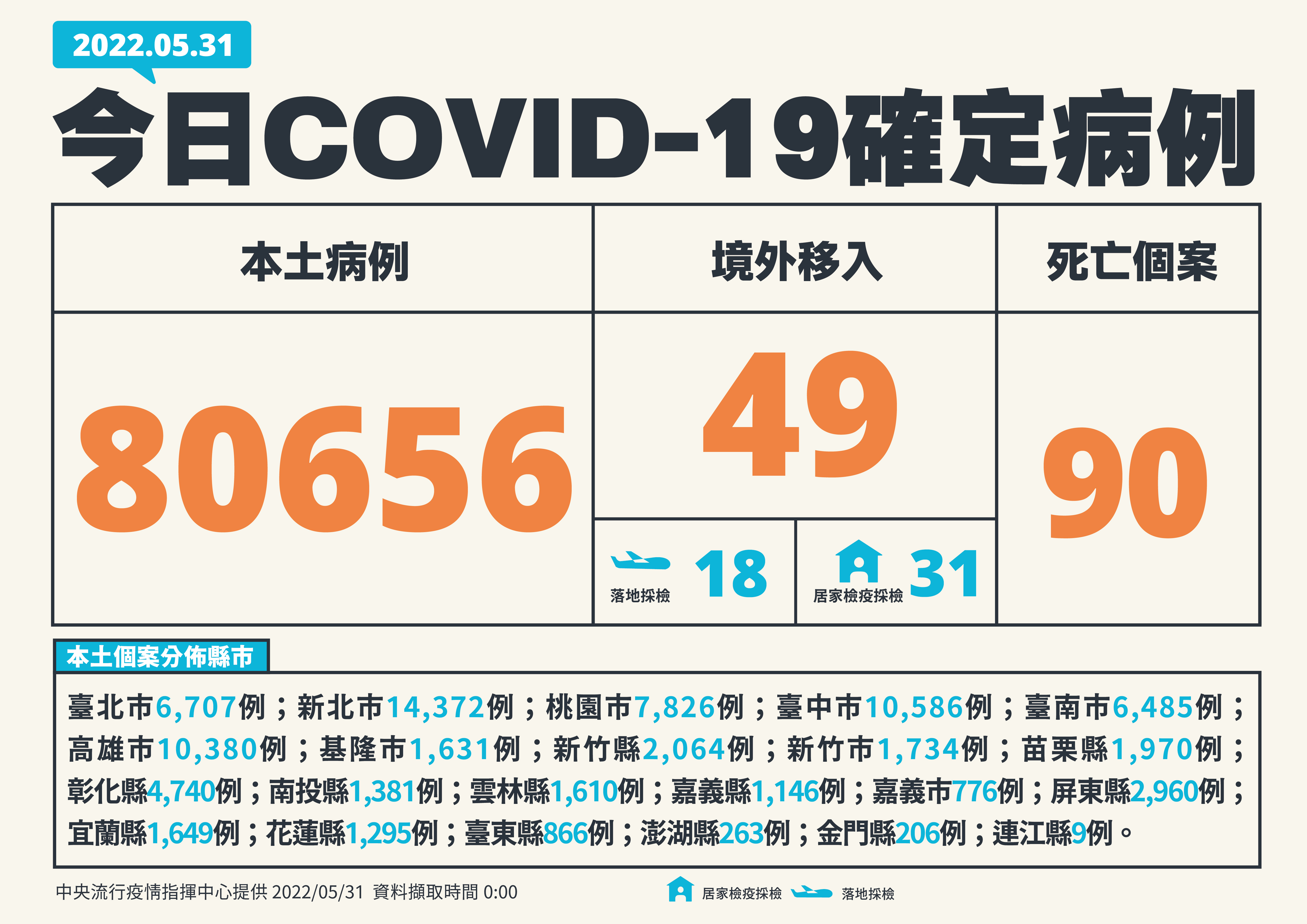 【健康醫療網/記者林哲遠報導】中央流行疫情指揮中心今(31)日公布國內新增80,705例COVID-19確定病例,分別為80,656例本土個案及49例境外移入(18例為航班落地採檢陽性);另確診個案中新增90例死亡。