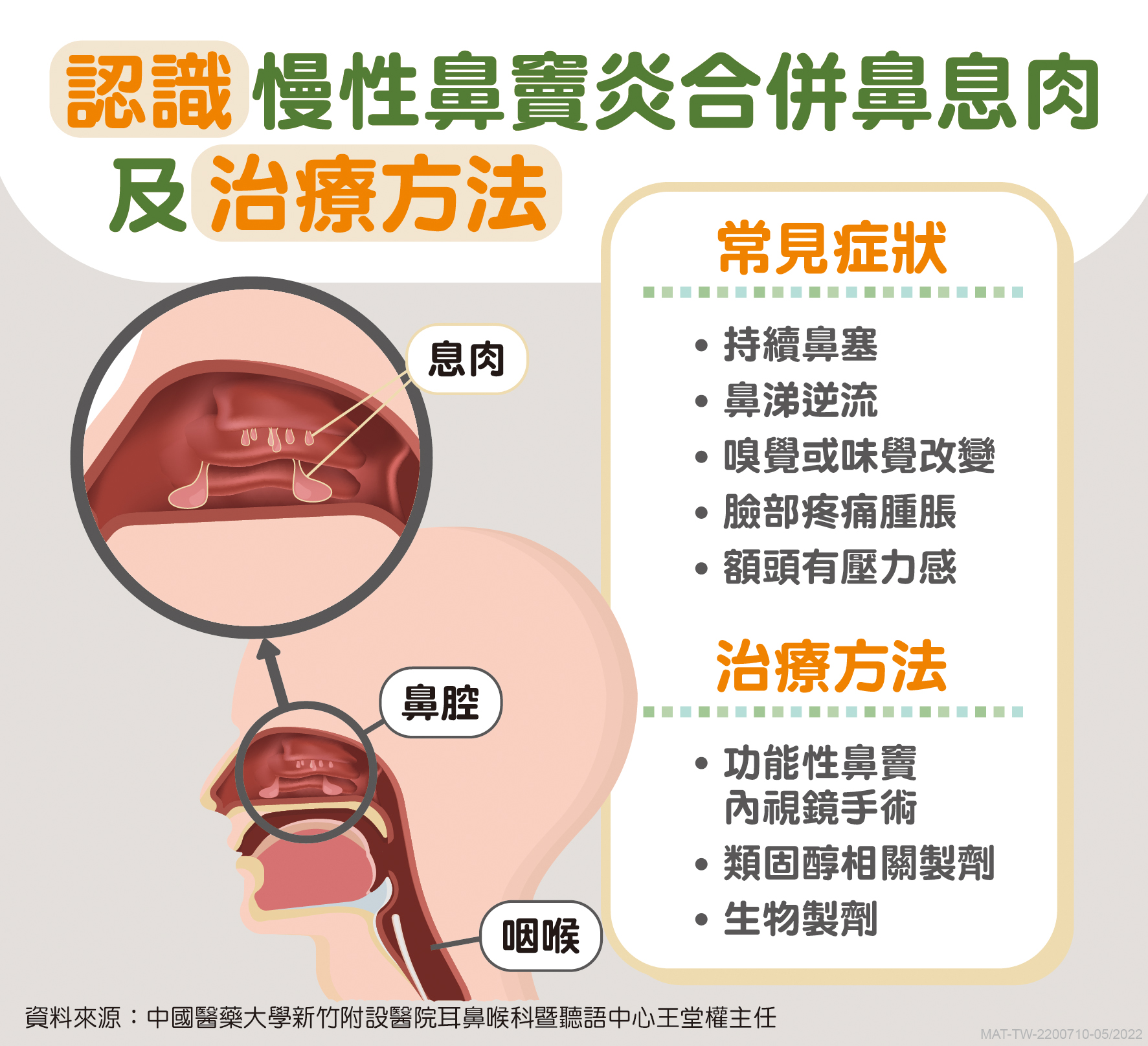 中國醫藥大學新竹附設醫院耳鼻喉科暨聽語中心王堂權主任表示,慢性鼻竇炎是一個嚴重影響生活品質的疾病,常見是在鼻竇急性發炎之後,身體免疫系統無法完全根除外來的病菌,或是接受常規醫療後的效果不盡理想,形成的慢性發炎的狀態。慢性鼻竇炎嚴重時會造成鼻腔及鼻竇黏膜組織增生,導致鼻息肉,容易出現鼻塞、鼻涕倒流、嗅覺異常或喪失、甚至可能有臉部腫脹悶痛、頭痛和眼窩脹痛等症狀,影響工作及生活。