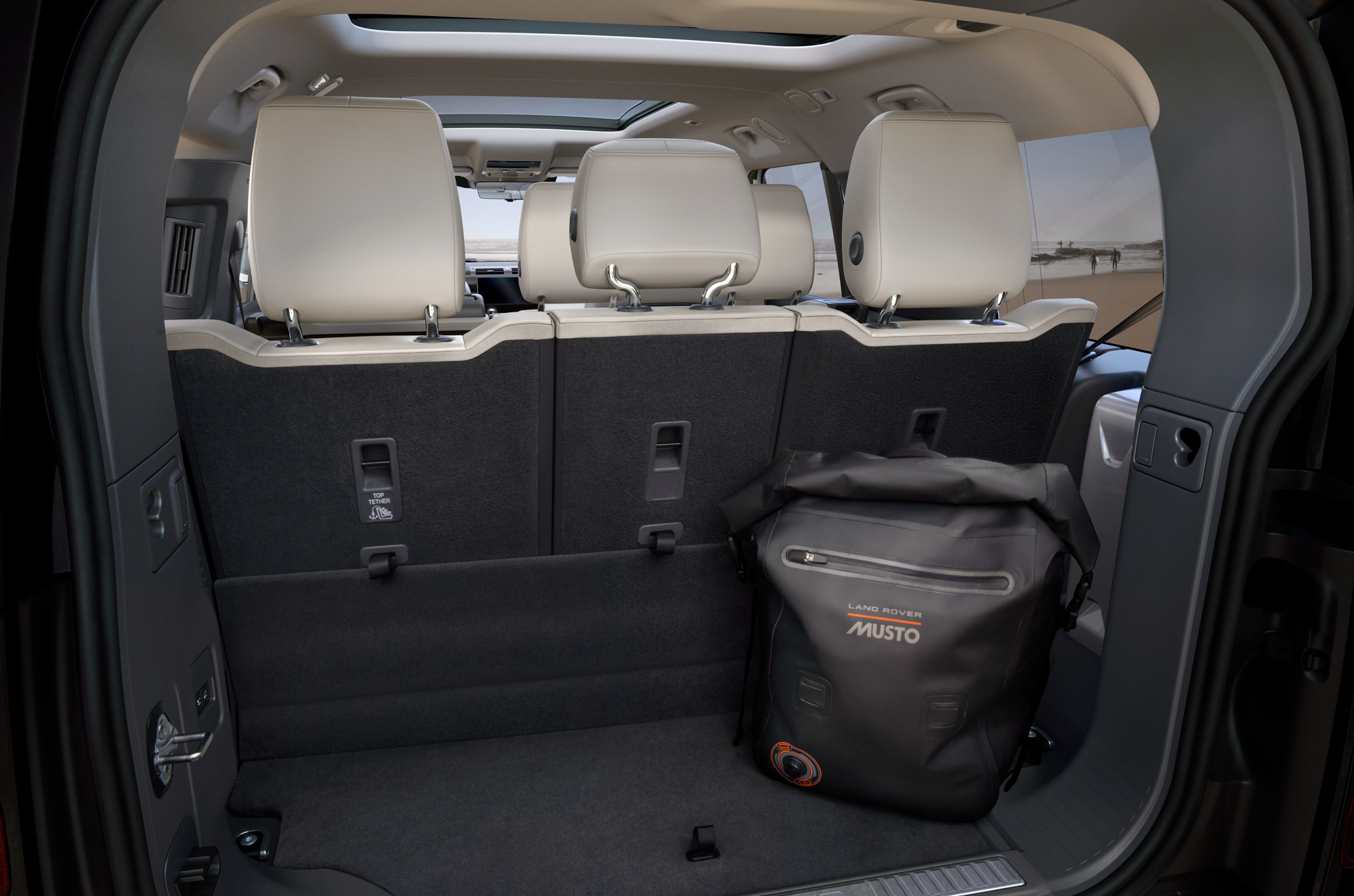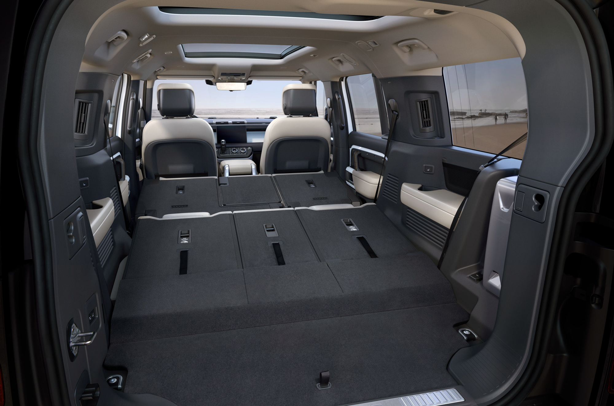 受益於劇院式座椅設計,第二排和第三排的乘客也得以獲得優異的視野。透過第二排座椅前、後滑動並向前折疊以提供寬敞的開口,進入第三排也毫不費力。在車尾,車主可以通過後廂空間內的調整按鈕輕鬆降低 Defender 的電子式氣壓懸吊,使裝載物品到後廂時更為便利。