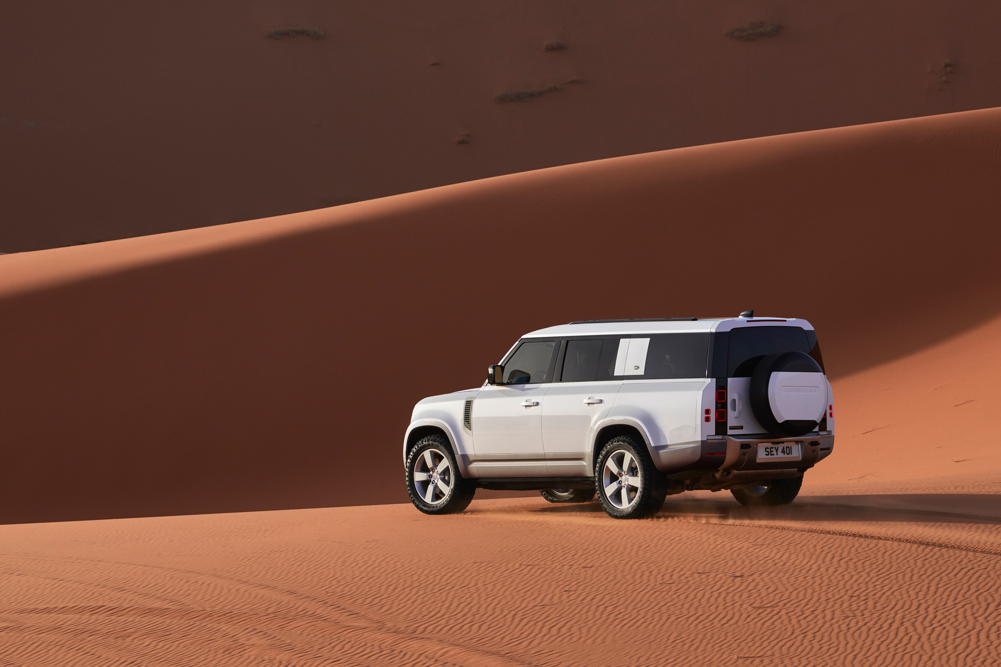 為了維持 Land Rover Defender 獨特的車尾設計,Land Rover 工程師發揮巧思打造類似船尾的形式向後提升,同時最大化車主對於 Land Rover Defender 絕佳全地形能力的期望,提供 28.5 度的離去角。車尾的 LED 燈組周圍經過重新設計,以確保定義 Land Rover Defender 側面輪廓的三個不同線條巧妙的向車後匯集。