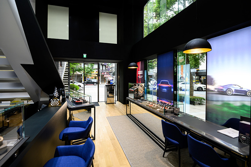 TAG Heuer 泰格豪雅專賣店運用大面積落地窗,使整體空間採光更加敞亮,從店內設計、櫃位構思,到整體細節與TAG Heuer 泰格豪雅的貼合度,都是雙方深度討論規劃而來。而除了上述的公開空間之外,專賣店後方VIP 室九宮格狀的佈景展示了Monaco系列各式錶款,將TAG Heuer 泰格豪雅的奢華、賽車、生活風格等元素淋漓盡致地展現,提供顧客一個更加隱密的鑑賞空間。