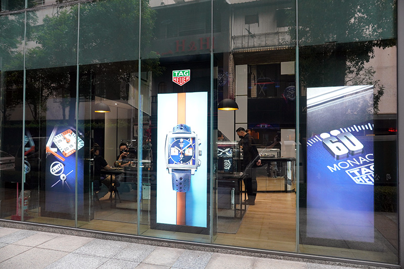 專賣店後方VIP 室九宮格狀的佈景展示了Monaco系列各式錶款,將TAG Heuer 泰格豪雅的奢華、賽車、生活風格等元素淋漓盡致地展現,提供顧客一個更加隱密的鑑賞空間。