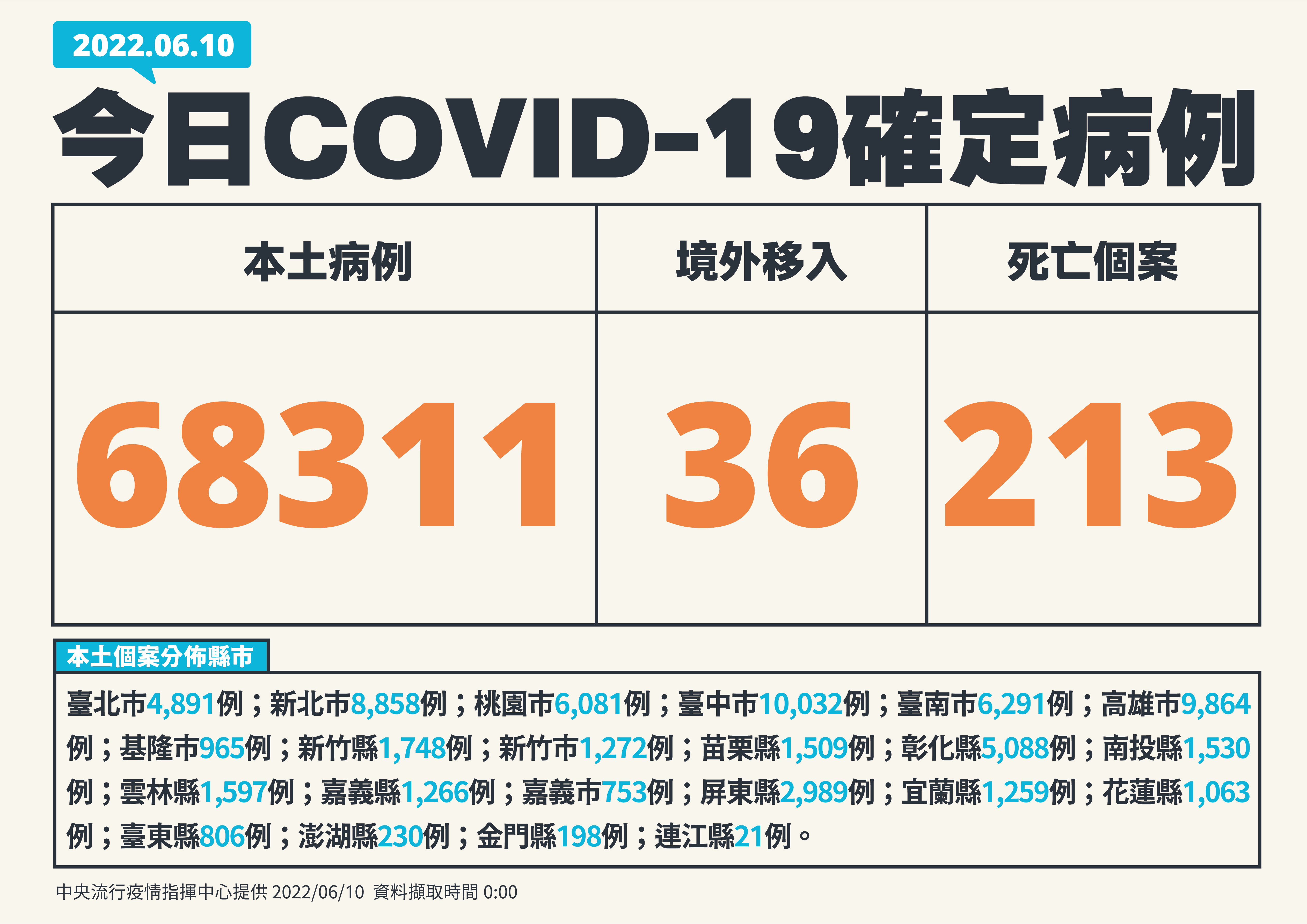 【健康醫療網/記者林哲遠報導】中央流行疫情指揮中心今(10)日公布國內新增68,347例COVID-19確定病例,分別為68,311例本土個案及36例境外移入;另確診個案中新增213例死亡。