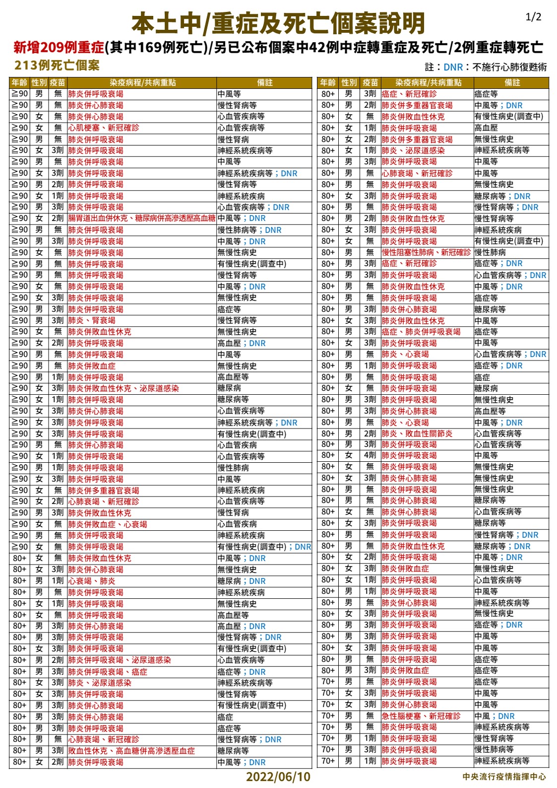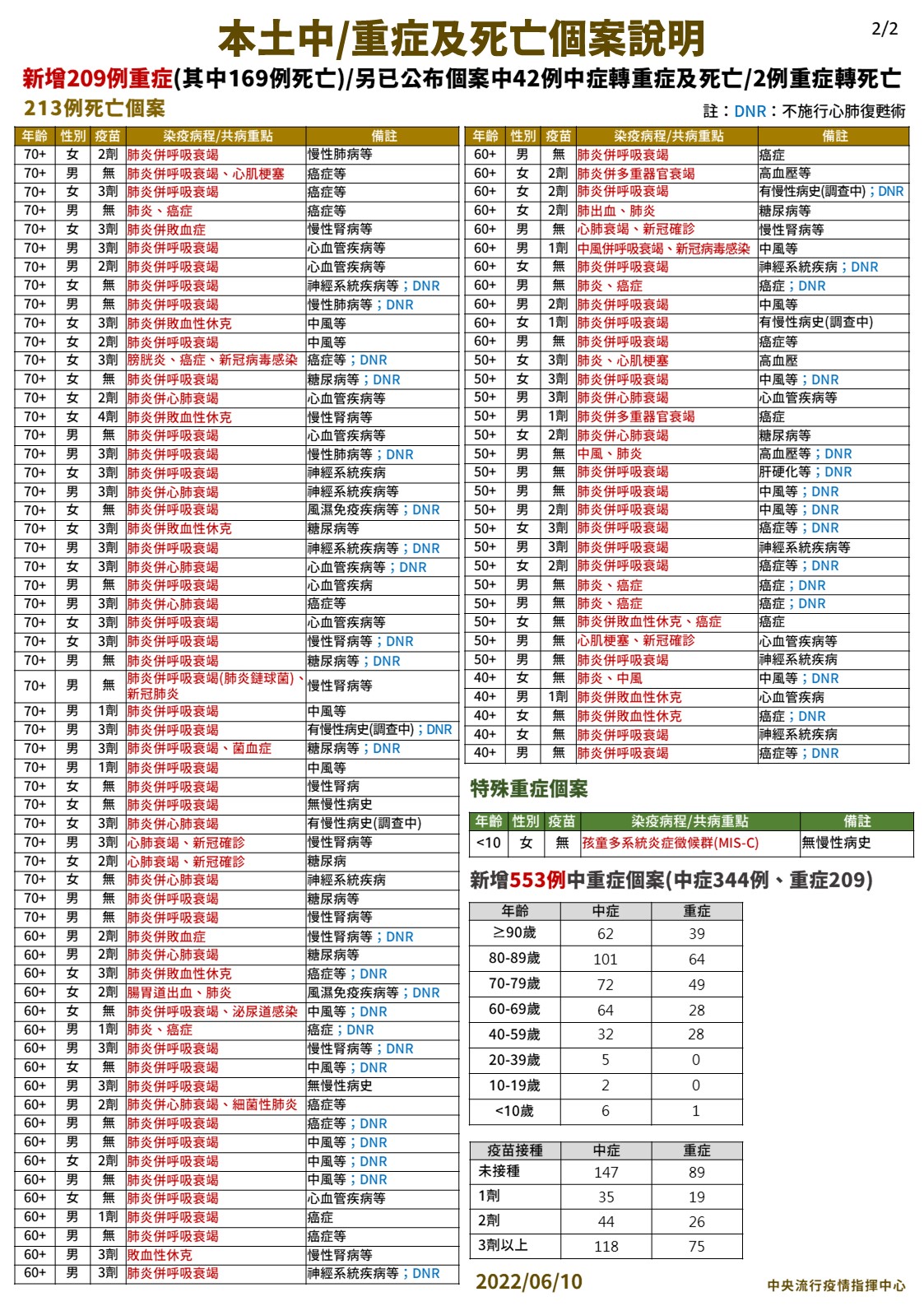 指揮中心指出,今日新增213例本土病例死亡個案,為120例男性、93例女性,年齡介於40多歲至90歲以上,皆屬重度感染個案、197例具慢性病史、135例未接種3劑 COVID-19疫苗。確診日介於今(2022)年5月8日至6月7日,死亡日期介於5月11日至6月8日。