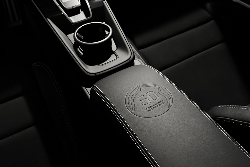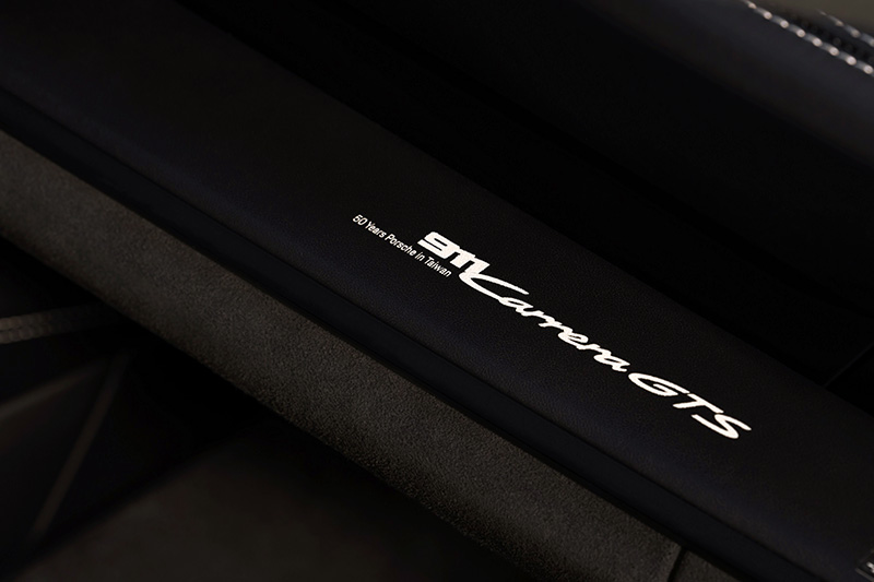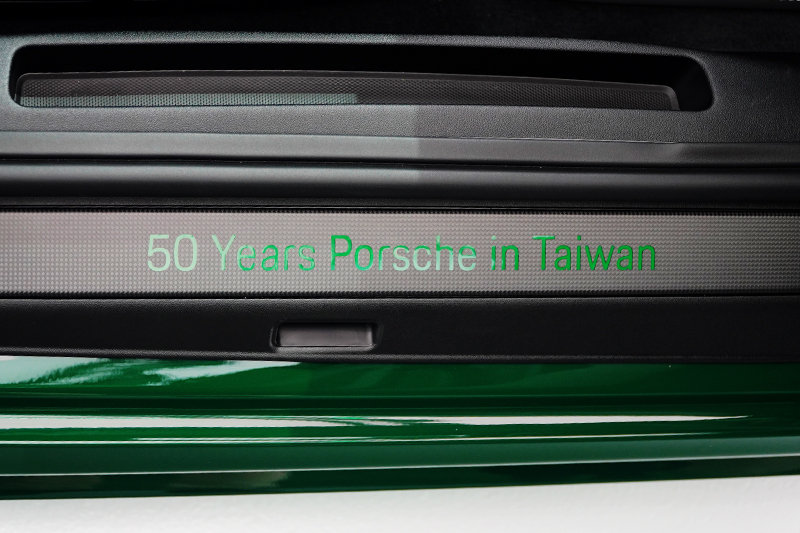 打開車門後,首先印入眼簾的是,鑲有「50 Years Porsche in Taiwan」專屬字樣的鋁合金自發光門檻,副駕駛座前方的中控台上也施有「911 Carrera GTS 50 Years Porsche in Taiwan」專屬字樣,中央置物盒蓋上施以獨特的台灣海岸線與「50」字樣的專屬徽印。外觀細節上也有獨特設計,尾燈線條中以消光黑呈現「PORSCHE」字樣,左後側窗內側的「Sonderwunsch」徽飾,其意為「特殊願望」,表明其「獨步紀念款」之名。