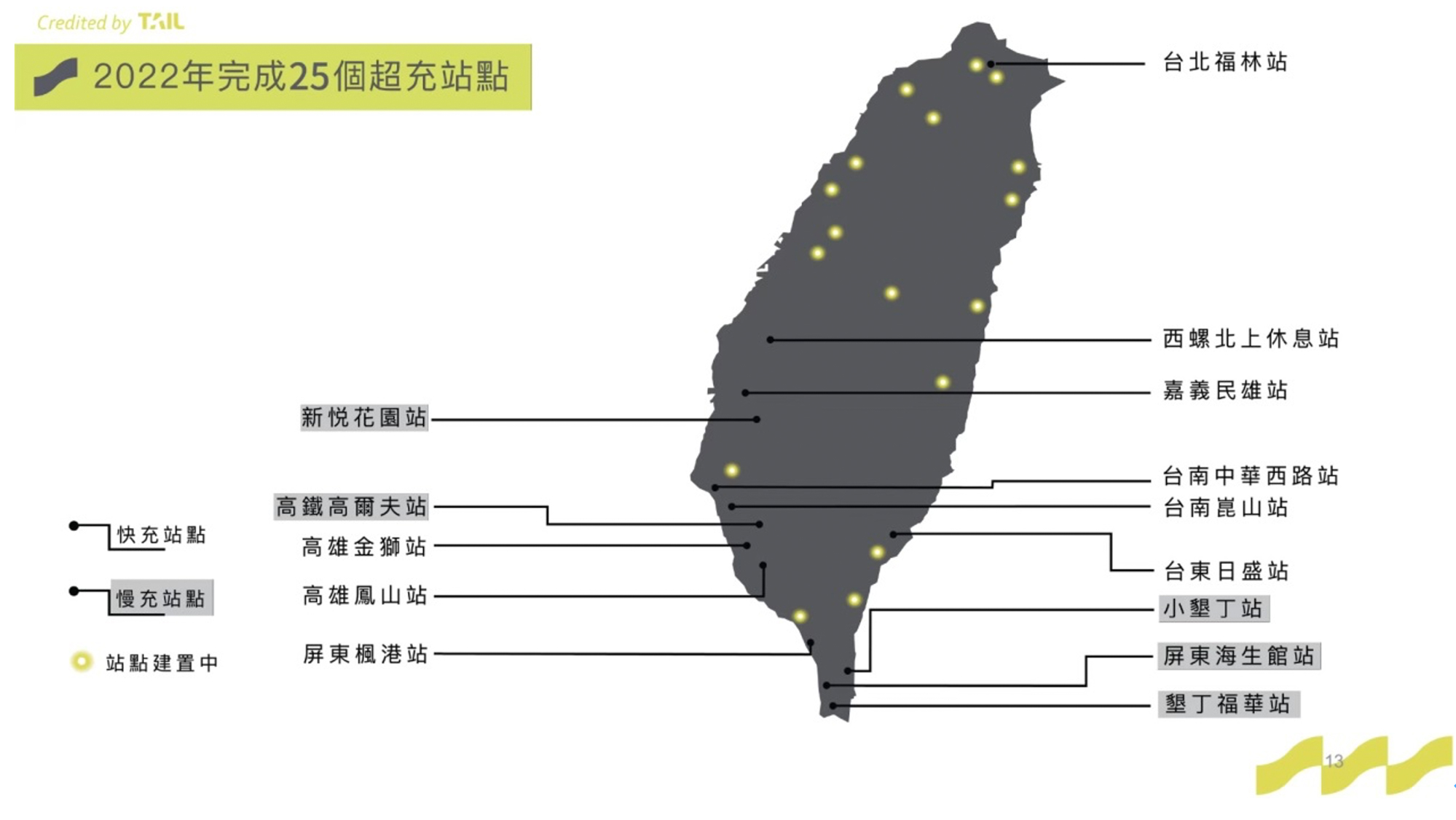 TAIL 特爾電力超快充服務品牌積極佈局國內充電基礎設施,以長途路網佈點及快充建置為主,除於交通樞紐幹道建置充電站點,站點更設置 200kW 充電功率且相容 CCS1 充電規格;目前8座充電站點包含台北福林站、西螺北上超充站、嘉義民雄站、台南崑山站、台南中華西站、台南捷豹路虎站、屏東楓港站、台東日盛站已投入服務行列,全新高雄三民區金獅站也即將上線;除超級快充站點之外,亦同步增設目的地充電據點,提供電動車主更便捷的充電服務網絡。