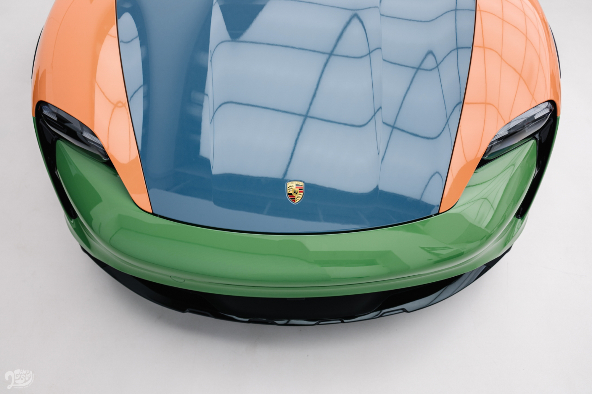 最初,在構思車身外觀配色時採用了 VR 技術。配色與裝飾件部門主管 Volker Müller 表示:「受參觀保時捷博物館的啟發,Sean 想到了在門上加入圓形元素,他的想法呼應了賽車歷史上的圓形車身編號圖騰。同時,在車側大面積處採用互補色。」