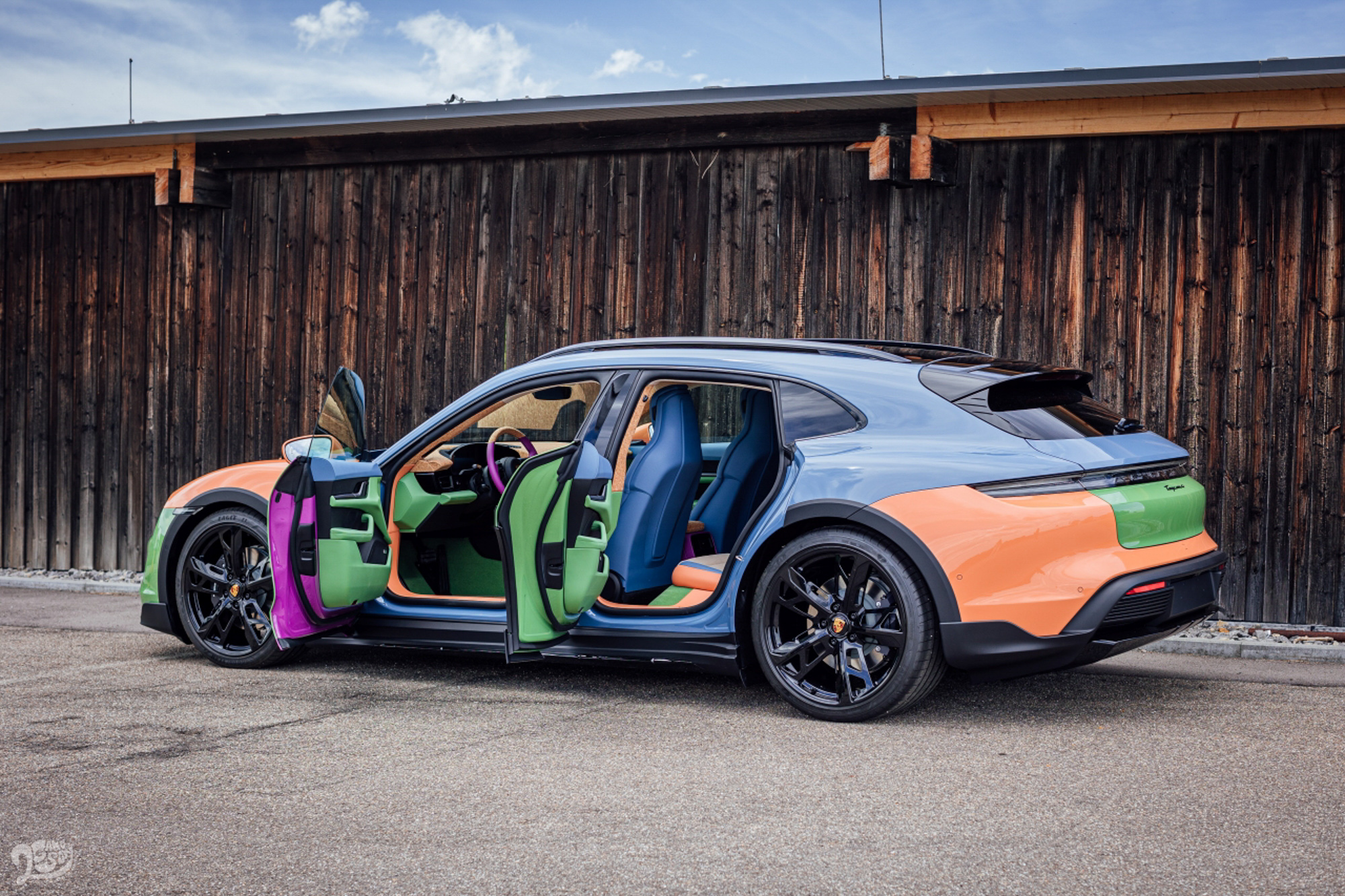 由 Wotherspoon 設計的 Taycan 4 Cross Turismo 融合了 Porsche Exclusive Manufaktur 的元素。其中包括 21 吋Cross Turismo Design 輪圈和後雨刷護蓋均施以高光澤黑色烤漆 - 以及帶有黑色保時捷字樣的尾燈條。客戶可以在Porsche Exclusive Manufaktur 的 Sonderwunsch 計劃中選擇類似的項目,而這項始於 2021 年的服務重現 1970 年代末著名客製化服務。其中一個例子便是利用 Paint to Sample Plus 服務讓 Wotherspoon 所設計的四種顏色色塊外觀可在未來提供選擇。