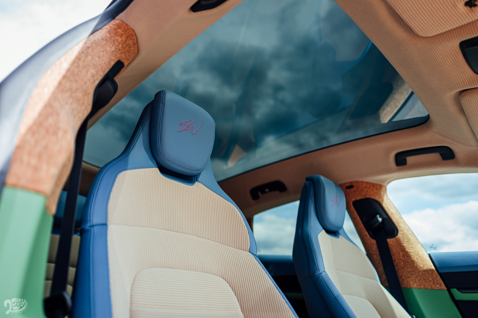 保時捷首次公開了這輛藝術車的內裝:鮮豔的色塊同樣延續 Nash Blue、Sean Peach、Loretta Purple 和 Ashley Green 等色彩,與儀錶板、方向盤和中控台上的軟木材質形成視覺對比。燈芯絨材質則為其增添另一種獨特風情。車內頂篷、中央椅面和遮陽板均採用荒漠米色(Atacama Beige)的燈芯絨裝飾。身為一位忠誠的純素食主義者,Wotherspoon不僅於內裝採用無皮革材質,同時也希望提供其他 Taycan 車主無皮革內裝的選擇。