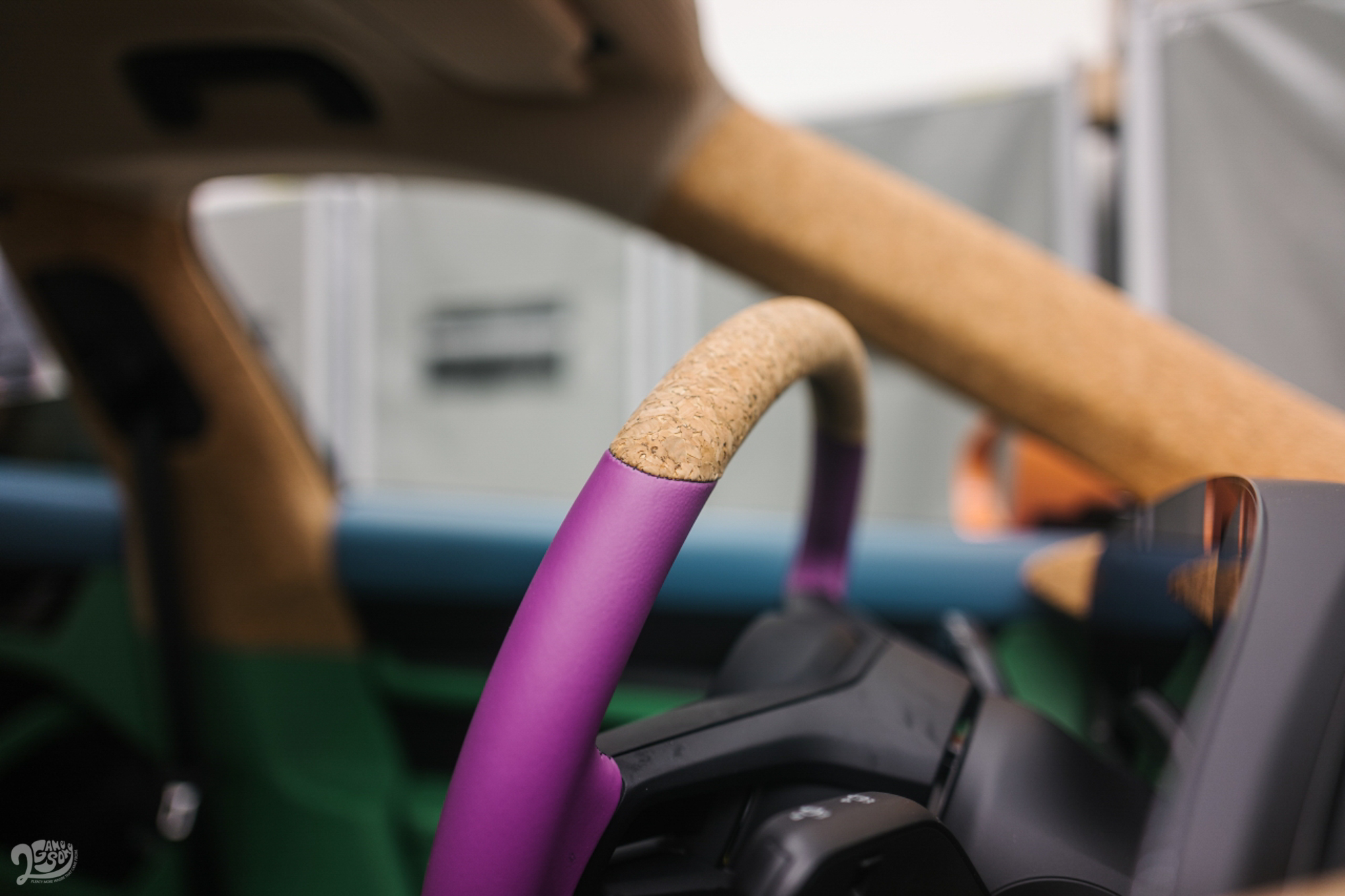 內裝的概念則是延續外觀色塊的設計。Wotherspoon 也使用他過去常用於街頭服飾的燈芯絨和軟木材質,燈芯絨在保時捷有著悠久的傳統,早在 1952 年,保時捷 356 的中央椅面材質就採用了柔軟的螺紋燈芯絨。在新的藝術車中,這種編織材料採用了荒漠米色,而保時捷在 2020 年的 911 Targa 4S Heritage 車型上便使用這種材料。Müller 表示:「使用軟木材質對我們修邊機是很大的挑戰。」成捲的軟木最終成功塑造成複雜的形狀,如儀錶板。