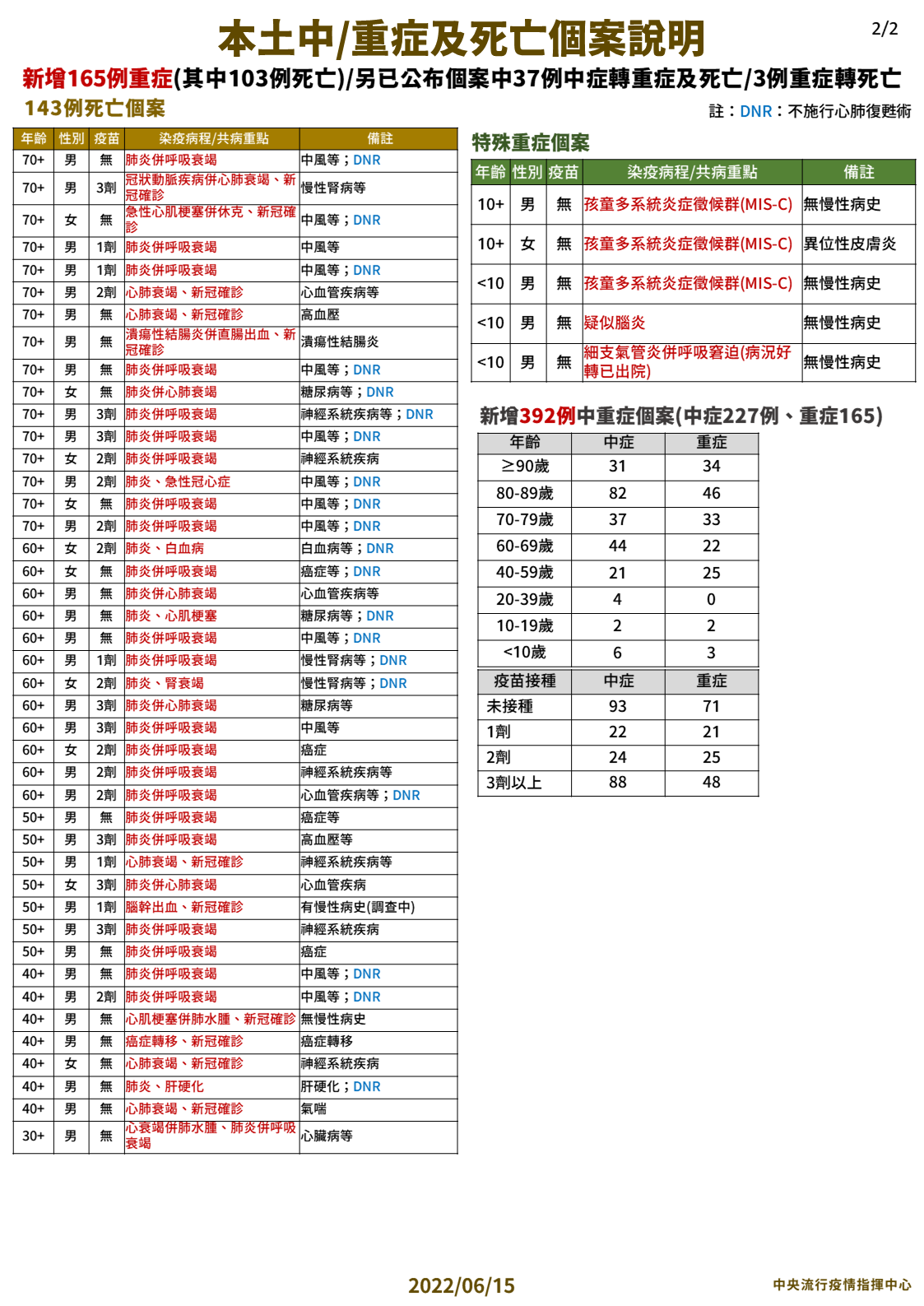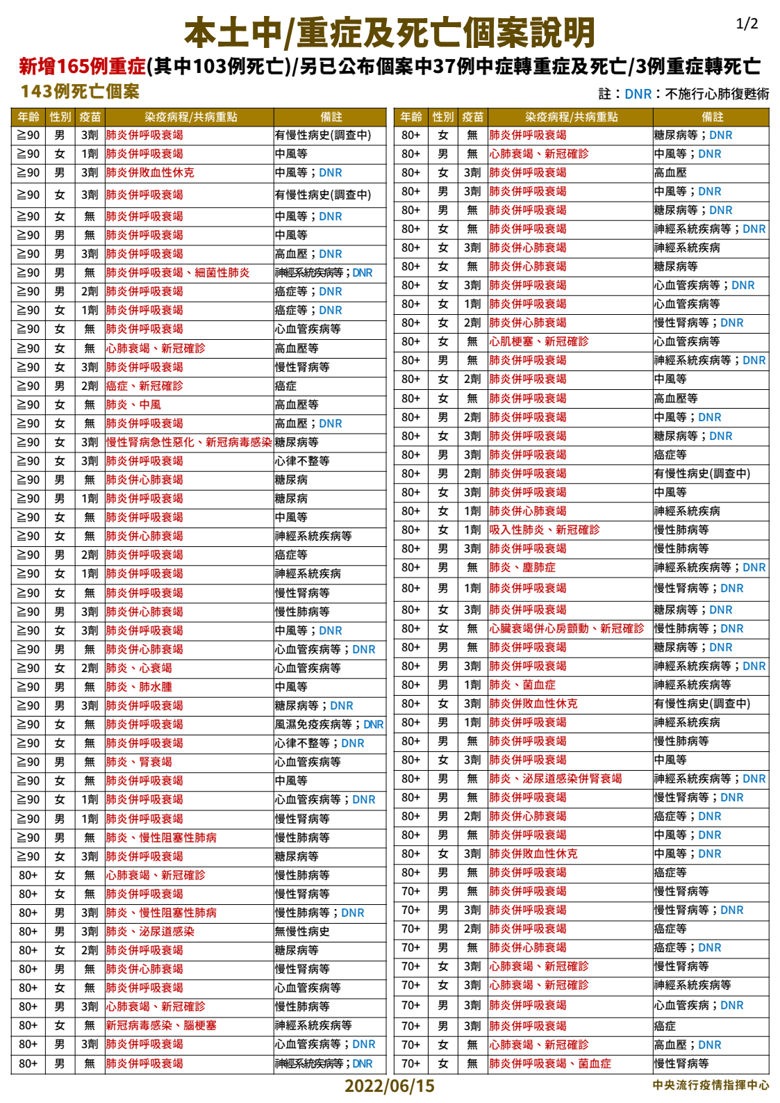 指揮中心指出,今日新增143例本土病例死亡個案,為82例男性、61例女性,年齡介於30多歲至90多歲以上,皆屬重度感染個案、141例具慢性病史、102例未接種3劑 COVID-19疫苗。確診日介於今(2022)年5月18日至6月12日,死亡日期介於5月28日至6月12日。