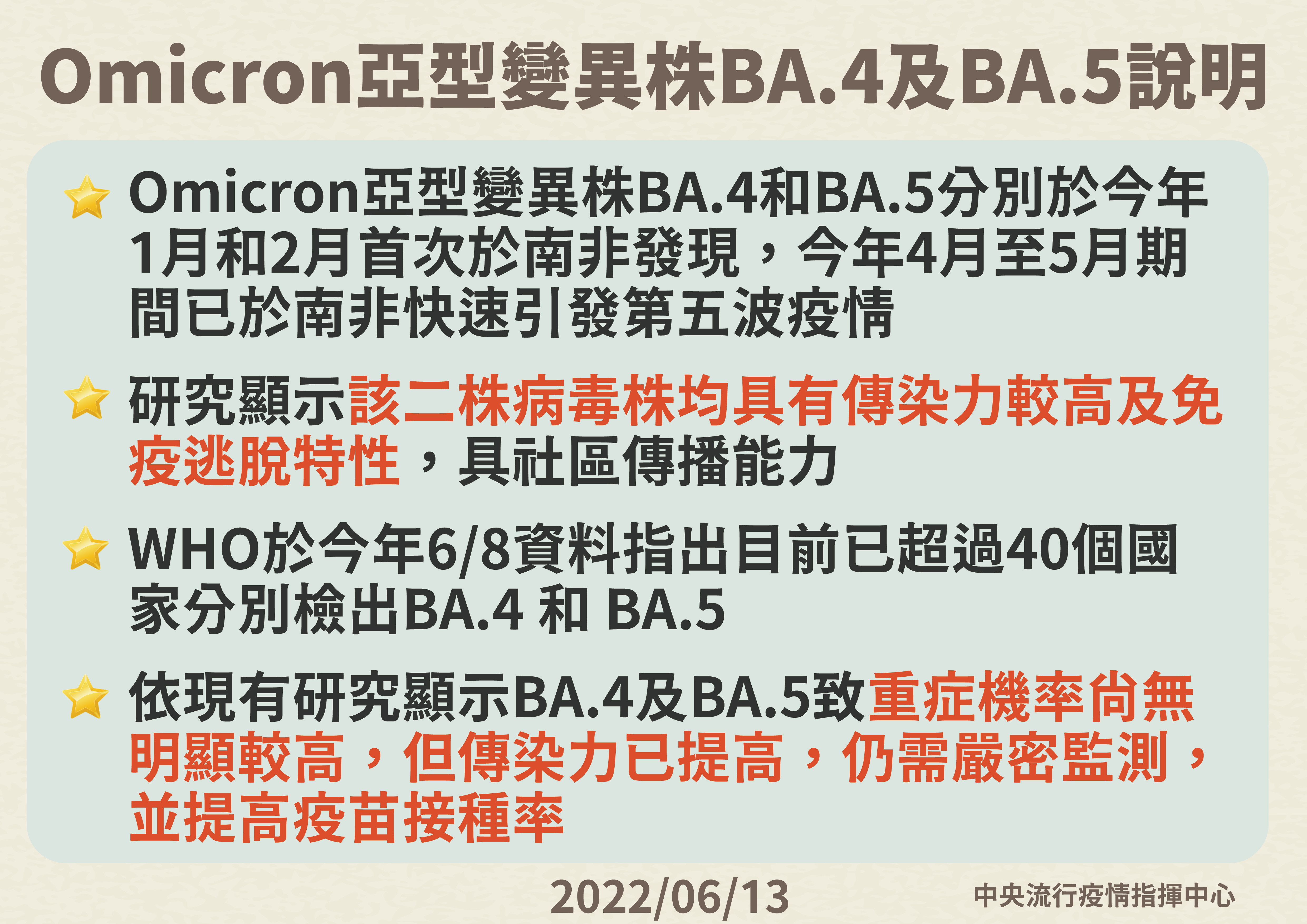 指揮中心說明,國際上Omicron亞型變異株BA.4及BA.5分別於今年1月及2月首次於南非發現,研究顯示該二株病毒株均有傳染力較高及免疫逃脫特性,具社區傳播能力,今年4月至5月期間已於南非快速引發第五波疫情;WHO於今年6月8日資料指出,目前已超過40個國家分別檢出BA.4 及BA.5,且全球發現該二株變異株感染國家及病例數均持續增加。
