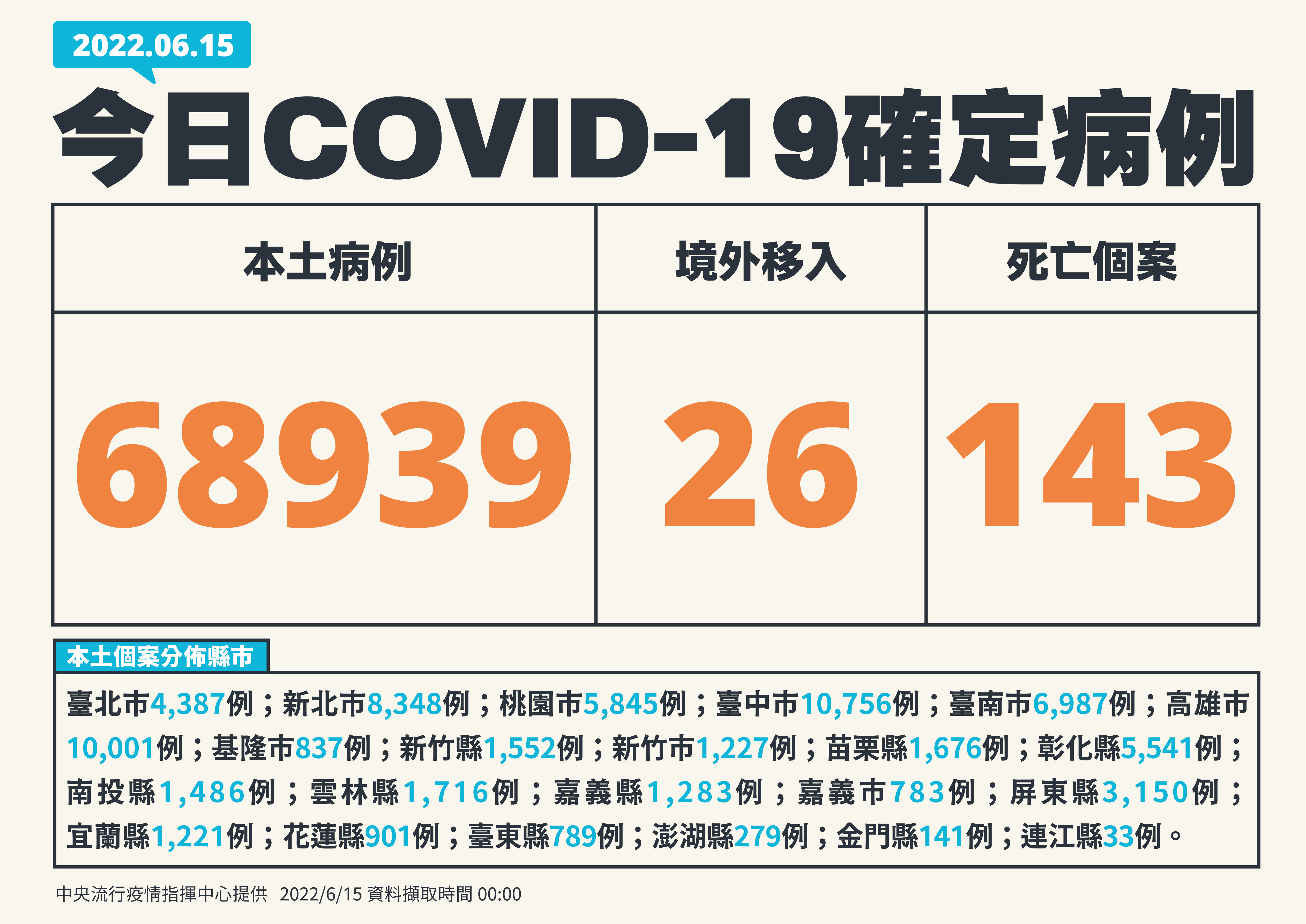 【健康醫療網/記者林哲遠報導】中央流行疫情指揮中心今(15)日公布國內新增68,965例COVID-19確定病例,分別為68,939例本土個案及26例境外移入;另確診個案中新增143例死亡。
