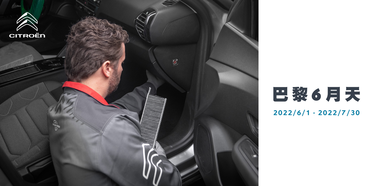 2022 CITROËN巴黎6月天冷氣健診服務活動自即日起至2022年7月31日止,為車主提供夏季免費健診服務及專屬零件優惠,活動期間內單筆消費發票金額滿NT$8,888元還可獲得法系經典車車野餐墊乙份。另外,服務活動出廠後,也歡迎踴躍分享本次巴黎6月天冷氣健診服務活動的返廠體驗,成功上傳問卷即有機會獲得CITROËN迷你模型車乙輛。