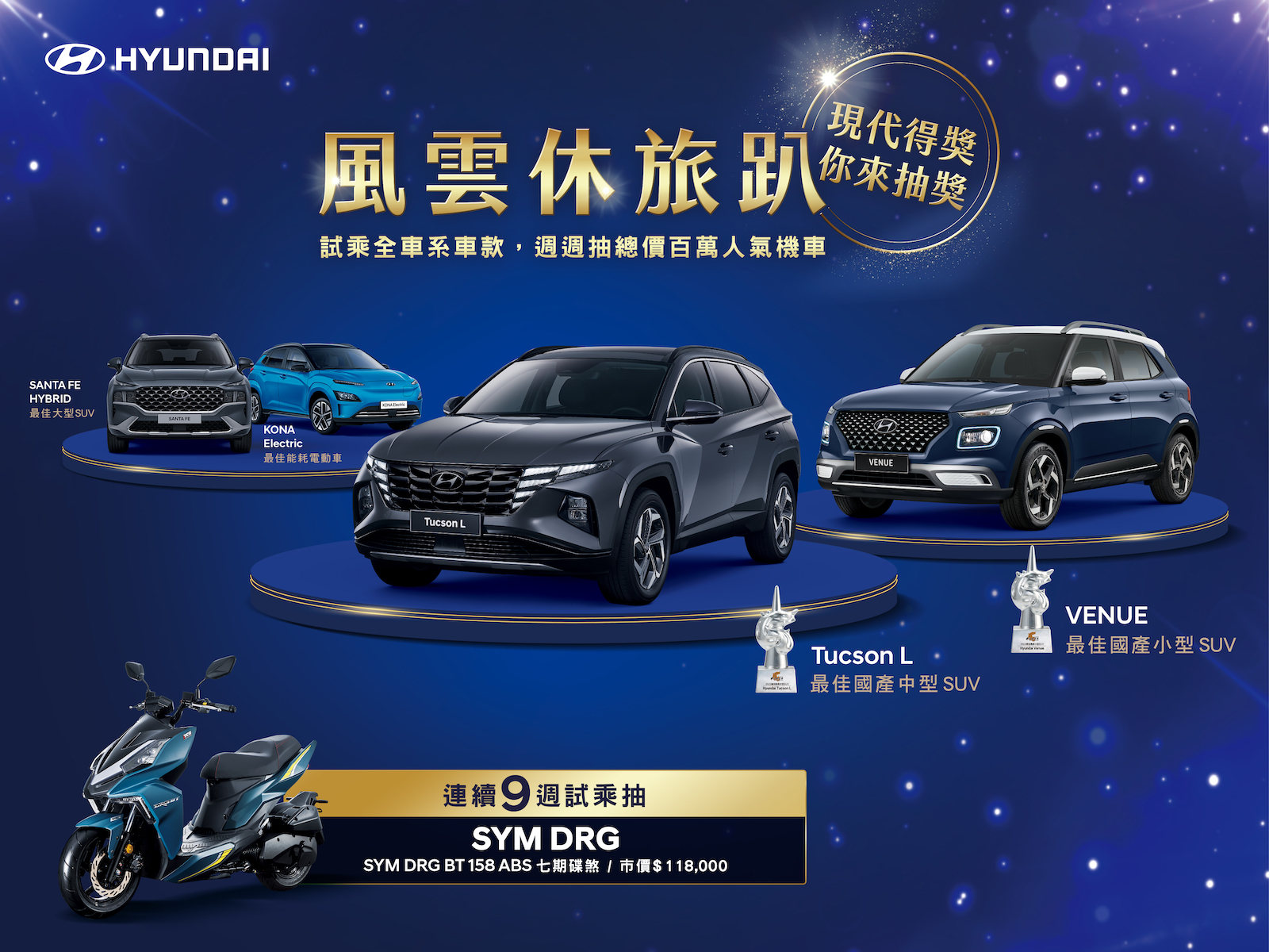 即日起試乘即可參加百萬好禮抽獎活動,連續九週送出超夯人氣的SYM DRG機車(市價$118,000元),防疫安心預約到府試乘亦可參加抽獎資格,詳情請洽全國HYUNDAI展示中心。