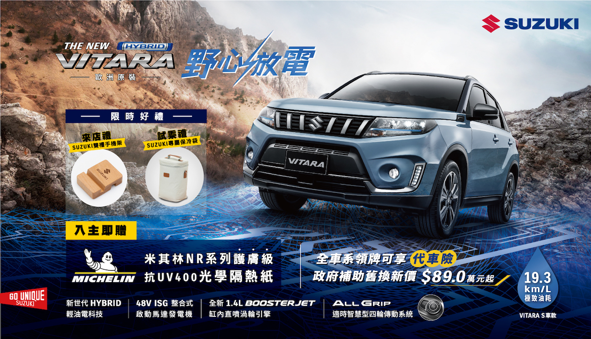 全車系 | 賞車贈SUZUKI專屬手機支架 試乘贈SUZUKI專屬保冷袋 領牌贈MICHELIN米其林NR系列護膚級抗UV400多層光學隔熱紙 領牌可享汽車代車費用保險 | 即日起-2022/06/30 |