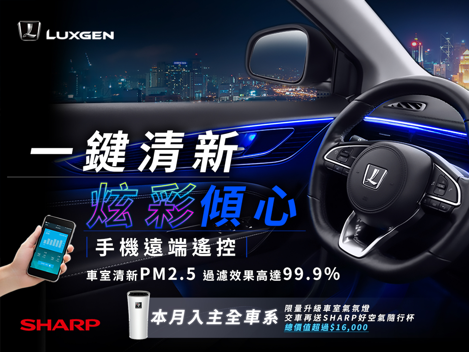 於6/1(三)起至6/30(四)止,入主LUXGEN全車系可享「一鍵清新、炫彩傾心專案」:購車限時加碼「環艙炫彩氣氛燈組」(價值12,000元)、可再享「60萬36期分期零利率」,同步免費升級「PM2.5健康對策濾網」、「終身免費返廠實施臭氧殺菌服務」等,交車完成者再送SHARP「好空氣隨行杯(4)-隨身型空氣淨化器」。