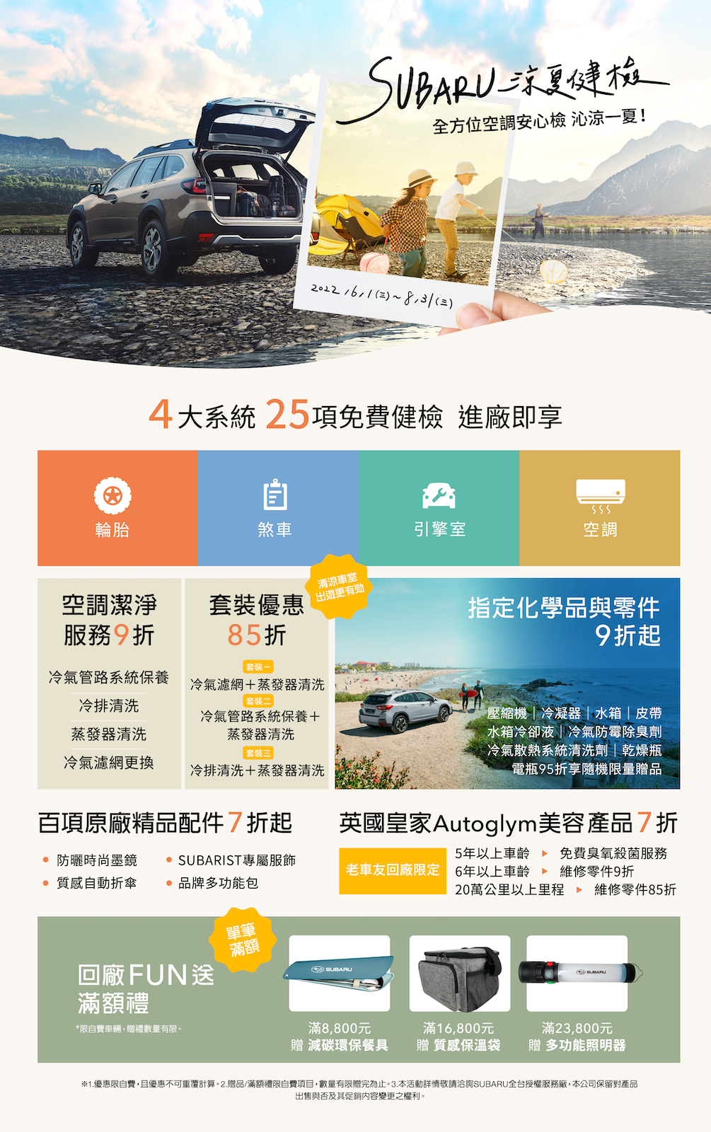 SUBARU自6月1日起至8月31日止,特別推出「2022 SUBARU涼夏健檢」,提供包含輪胎、煞車、引擎室、空調等四大系統共25項免費健檢。此外,更推出空調潔淨清涼系列9折、空調潔淨清涼套餐85折優惠,以及原廠零配件/美容產品等多重優惠回饋,單筆消費滿8,800元起再贈實用的夏日戶外必備好禮。