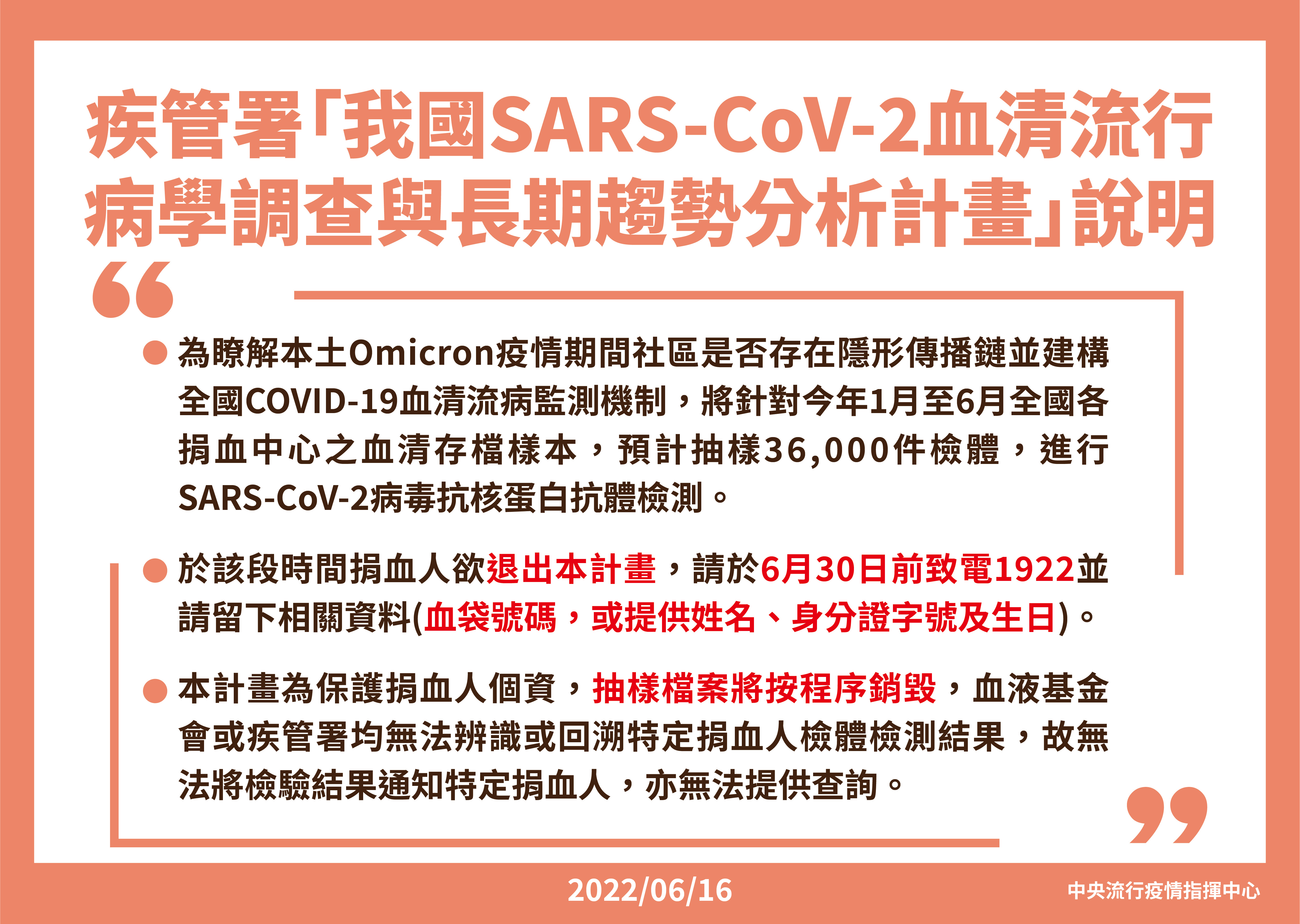 指揮中心說明,為瞭解今(2022)年4月份起爆發較大規模本土Omicron疫情期間,社區是否存在隱形傳播鏈,並建構全國COVID-19血清流病監測機制,前述計畫將與「醫療財團法人台灣血液基金會」(以下稱血液基金會)合作,針對今年1月至6月收受之全國各捐血中心之血清存檔樣本,依各縣市人口、性別、年齡比例進行分層隨機抽樣,每2週1次,每次3,000-3,500件,預計抽樣36,000件檢體;該時段有捐血的民眾被抽到之機率約3-4%。