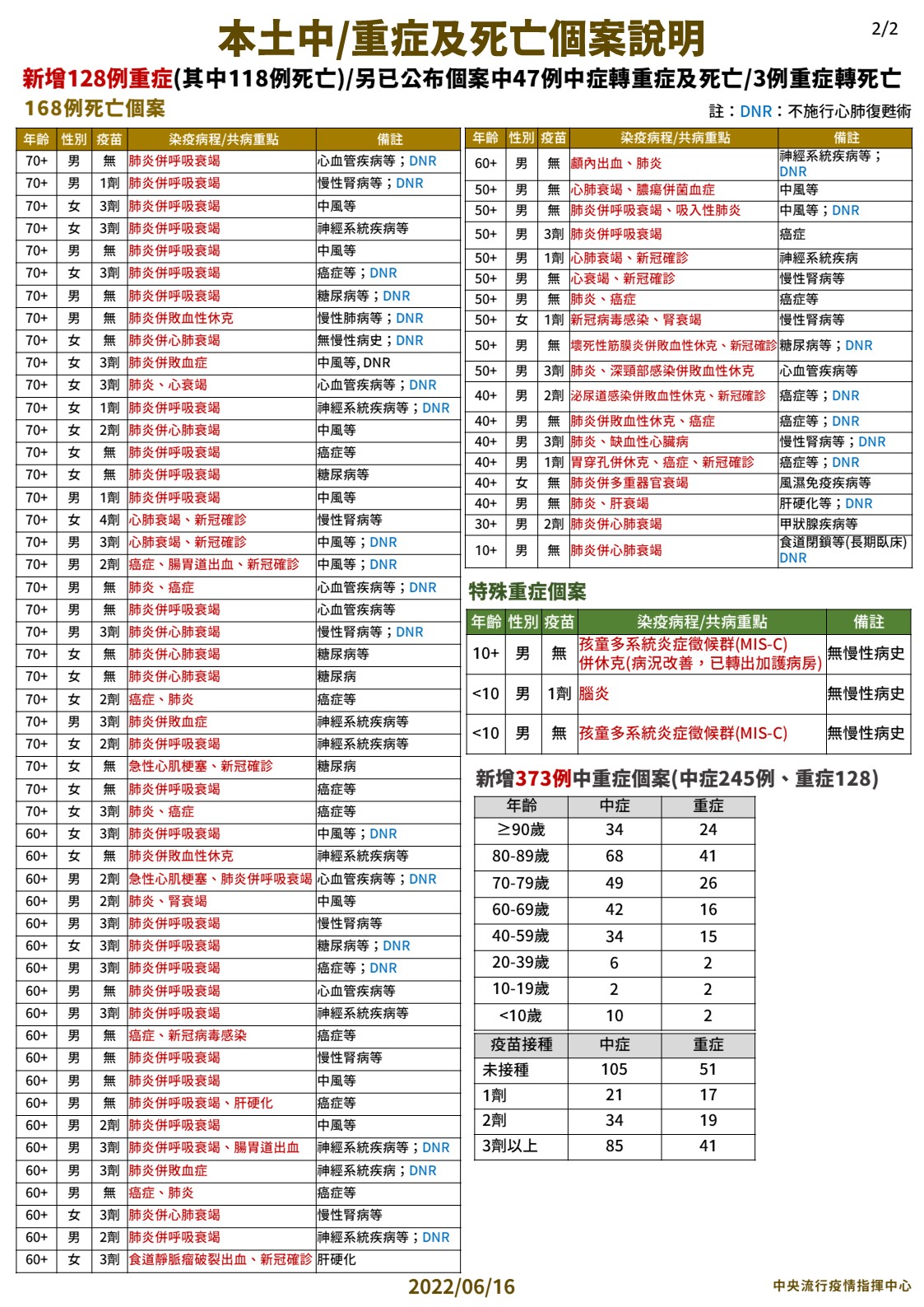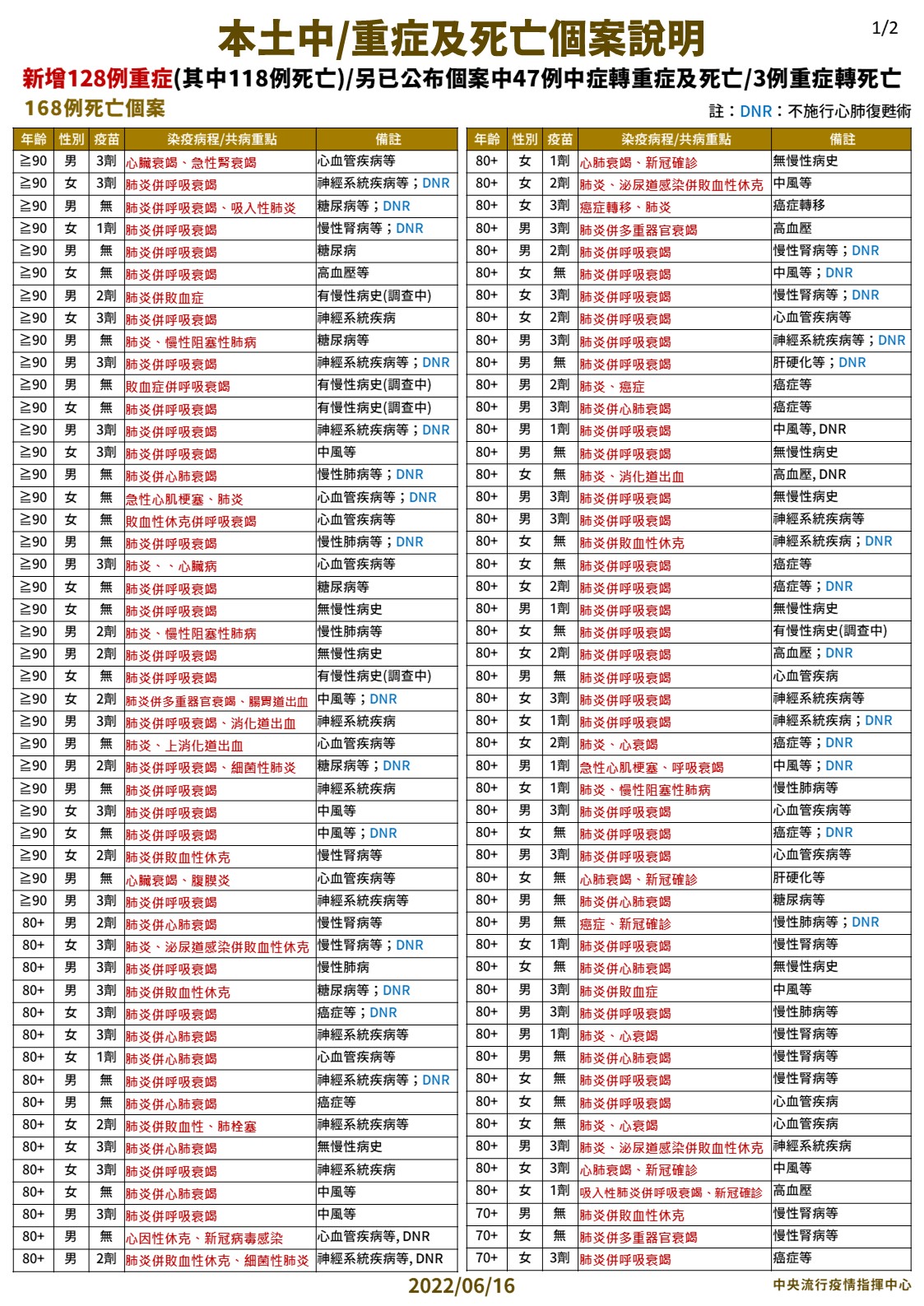 指揮中心指出,今日新增168例本土病例死亡個案,為93例男性、75例女性,年齡介於10多歲至90多歲以上,皆屬重度感染個案、159例具慢性病史、113例未接種3劑 COVID-19疫苗。確診日介於今(2022)年5月5日至6月13日,死亡日期介於5月26日至6月13日。