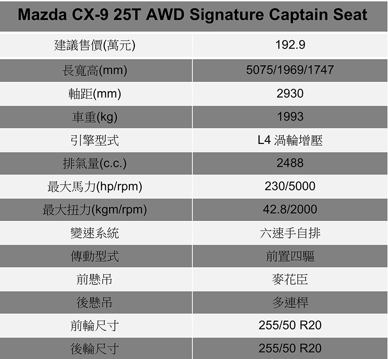 輪圈採20吋亮銀分割造型。 Mazda除具有質感的造型設計,座艙更有著超越同級媲美豪華品牌的精緻設計,尤其CX-9旗艦車型更為講究,此次的25T AWD Signature Captain Seat車型所配置的第二排獨立座椅就進一步提升質感氛圍。首先採用Nappa真皮包覆與菱格紋設計的座椅,在實際乘座與視覺都給予高級商務般感受,可前後移動與椅背多段可調則實現對於舒適的要求,而座椅加熱控制、杯架與扶手組成的中央控台,更進一步提升整體乘坐舒適與豪華度。此外5,075mm車長尺碼與2,930mm軸距和第二排可前後移動等多項條件助益下,不僅替第二排創造寬敞的乘坐空間,就連第三排也擁有成人乘坐有充裕舒適的環境。