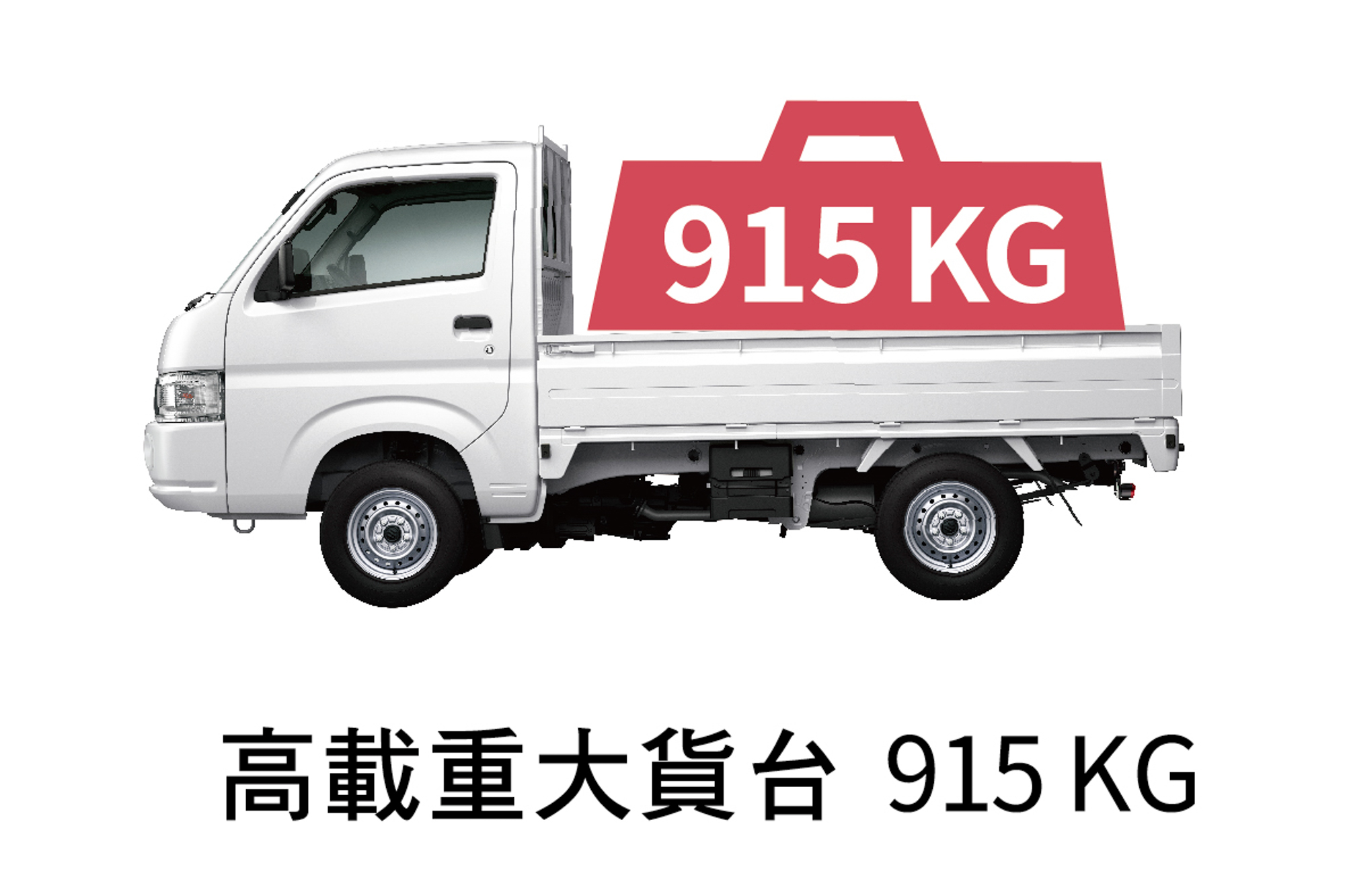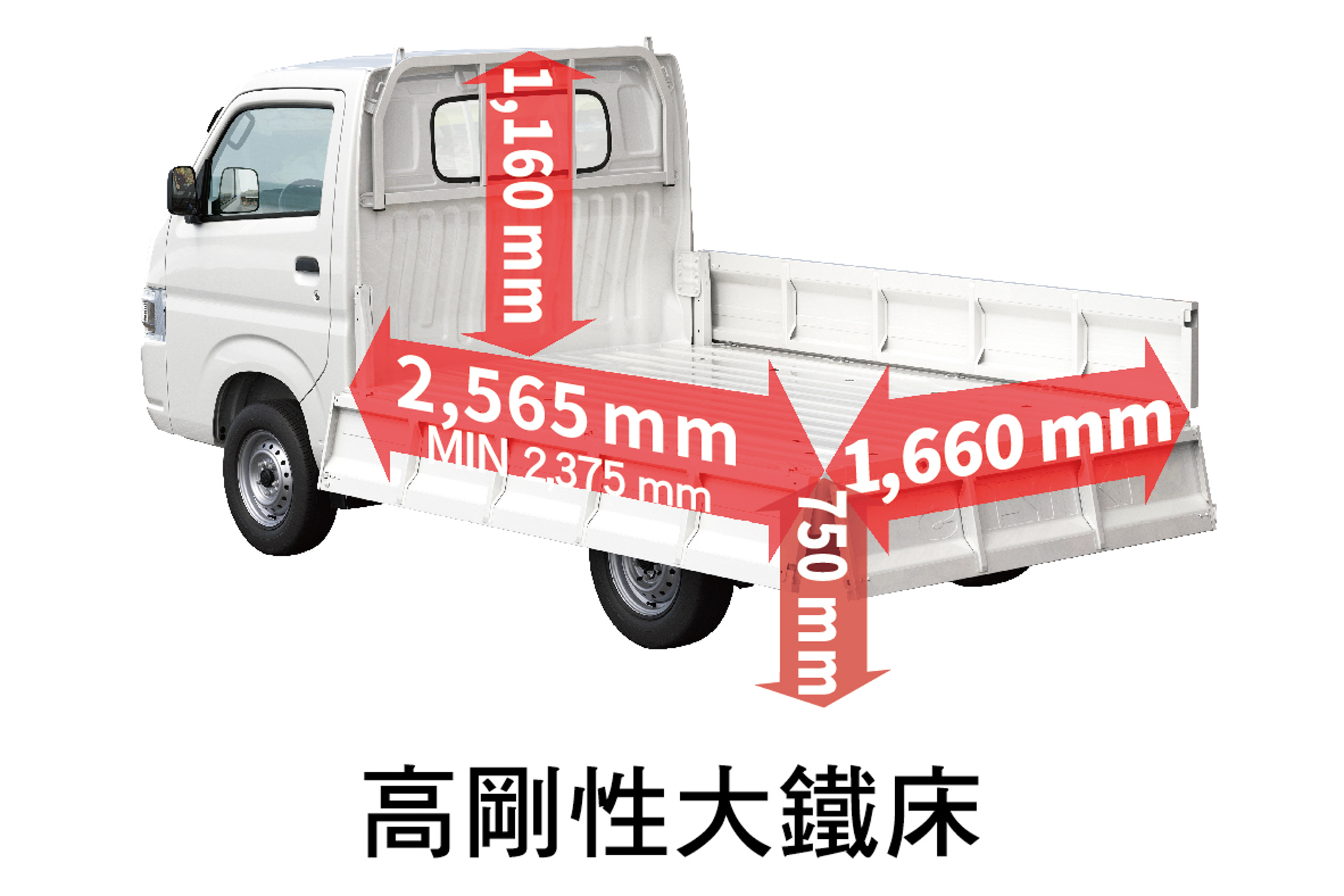 相較於乘用車的「拿來開」,商用車車主最在意的是「用來賺」,Carry 在幫忙賺的首要關鍵「貨台」規劃上,下足了得以全球熱賣超過 55 年的真功夫。在新車開發階段即做重點強化升級,首先在頭家最在乎的載運空間上,Carry 以 2,565mmx1,660mm 的超大貨台,傲視同級。至於載重能力更是優異,高達 915 公斤的強力承重,能夠滿足不同行業頭家的多元需求。