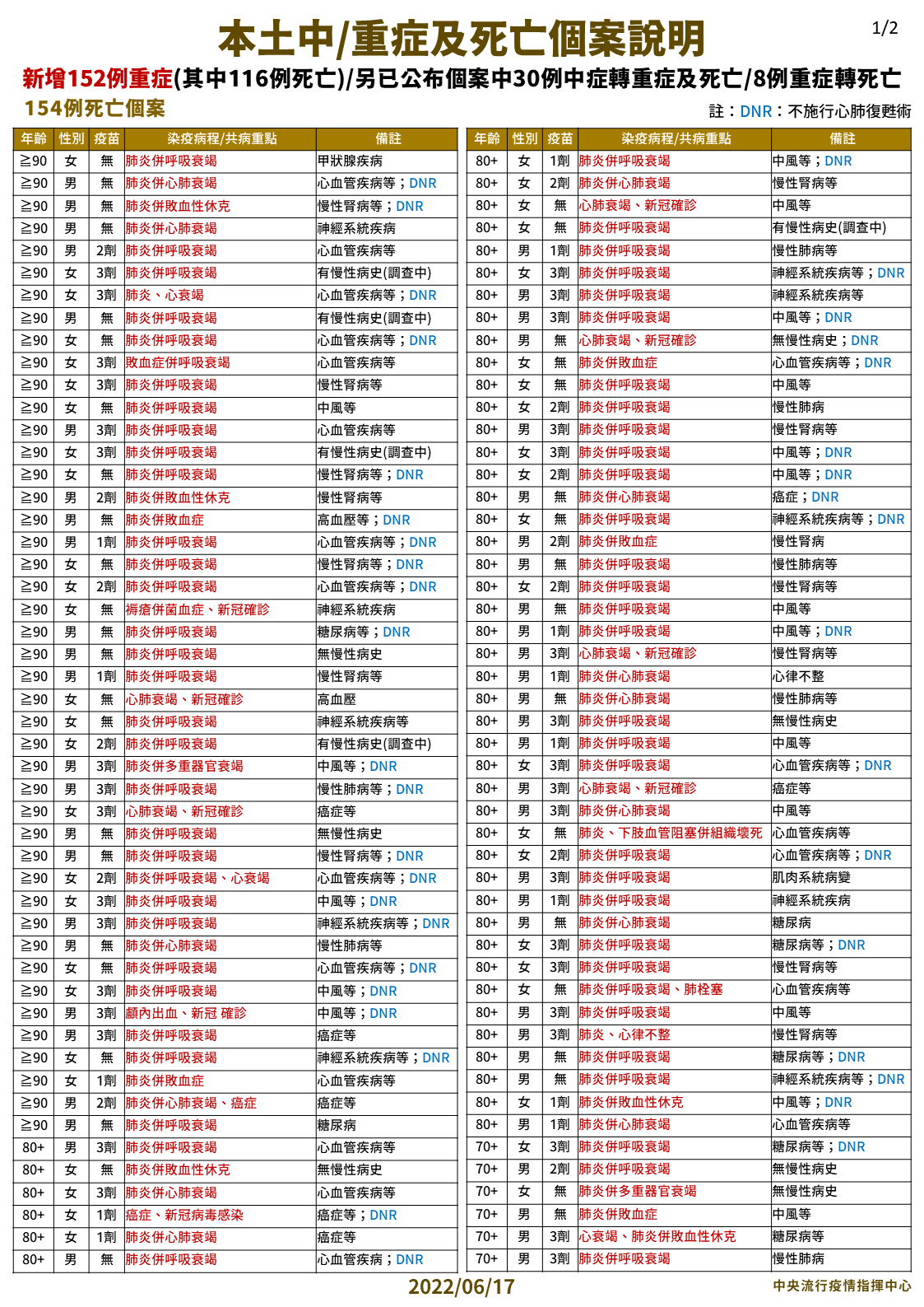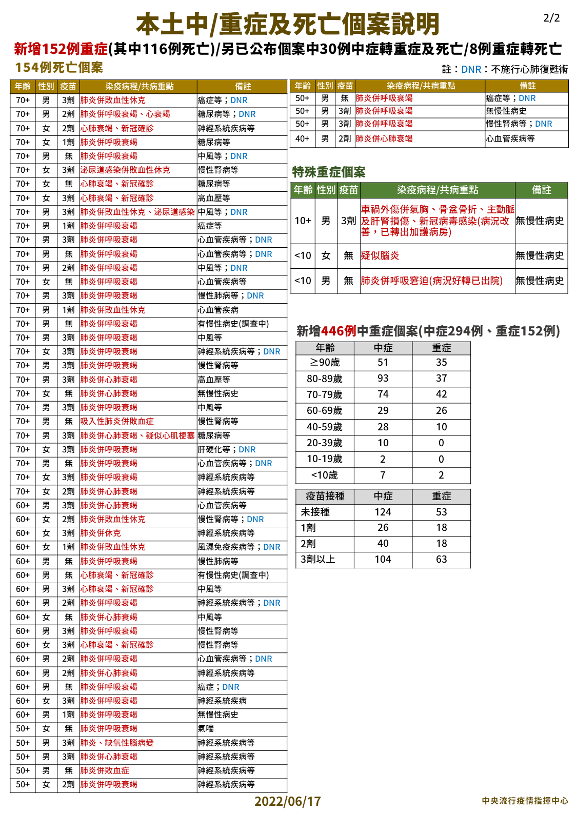 指揮中心指出,今日新增154例本土病例死亡個案,為88例男性、66例女性,年齡介於40多歲至90多歲以上,皆屬重度感染個案、144例具慢性病史、96例未接種3劑 COVID-19疫苗。確診日介於今(2022)年5月7日至6月14日,死亡日期介於5月11日至6月15日。