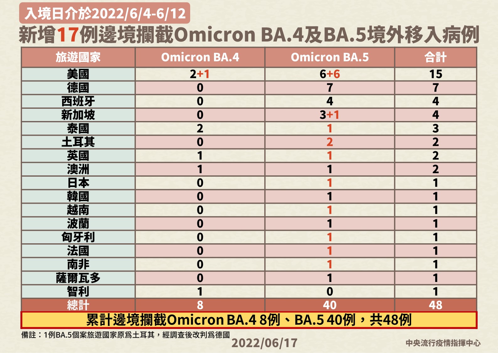 指揮中心表示,國內境外移入個案中新增檢出1株Omicron BA.4及16株Omicron BA.5,個案分別為13例男性、4例女性,年齡介於未滿10歲至70多歲,入境日介於今(2022)年6月4日至6月12日。其中檢出Omicron BA.4個案為自美國移入;檢出Omicron BA.5個案分別自美國(6例)、土耳其(2例)、日本、匈牙利、法國、南非、英國、泰國、越南及新加坡移入。