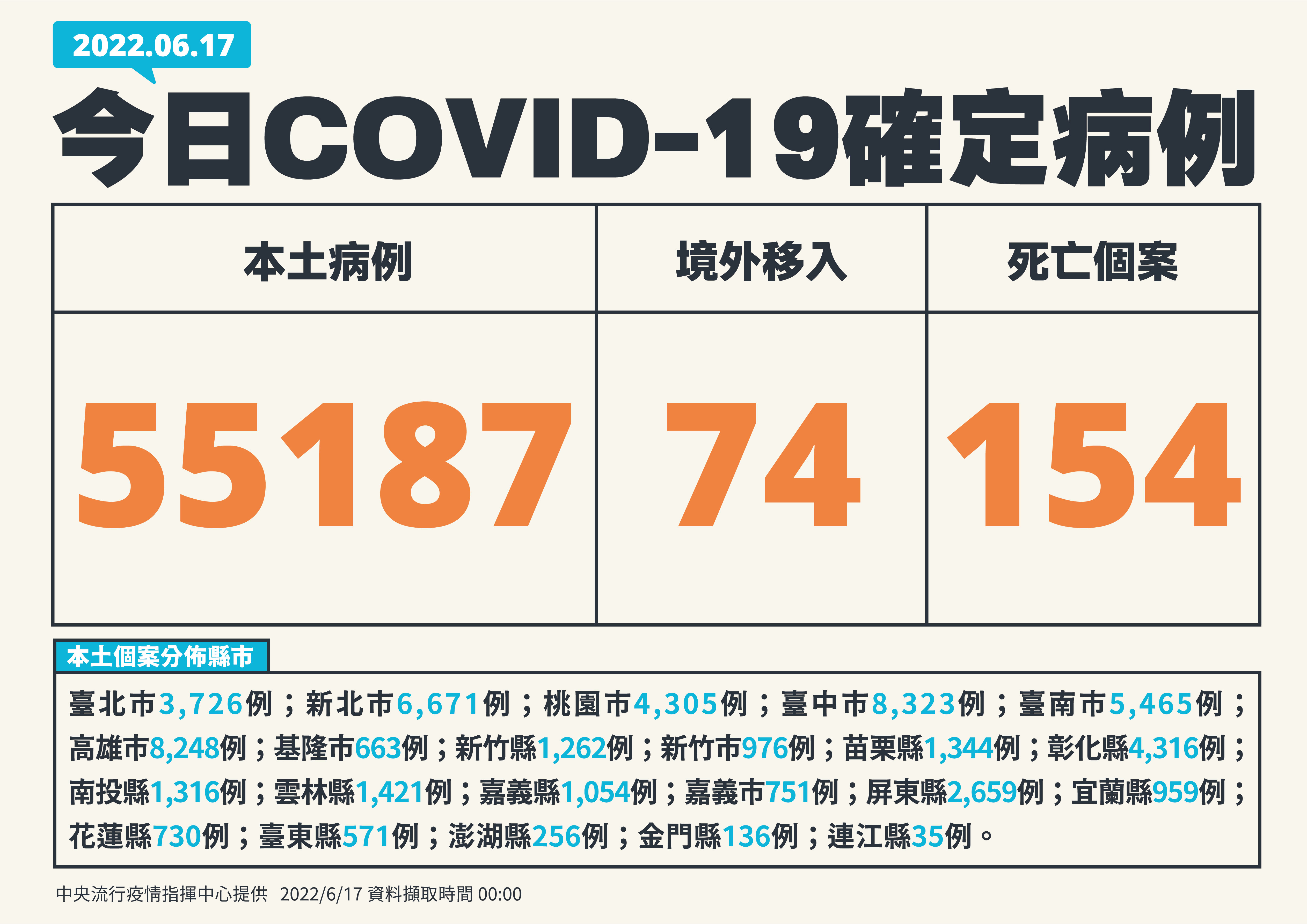 【健康醫療網/記者林哲遠報導】中央流行疫情指揮中心今(17)日公布國內新增55,261例COVID-19確定病例,分別為55,187例本土個案及74例境外移入;另確診個案中新增154例死亡。