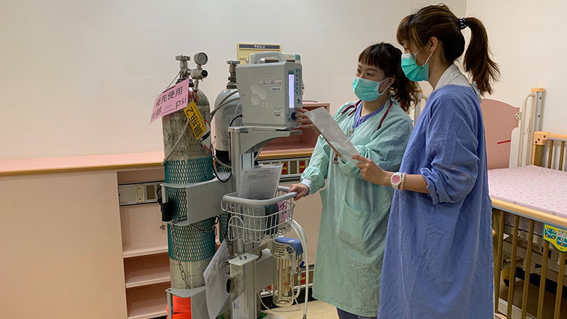 ▲一氧化氮專用呼吸器使用示意畫面(圖左:余采臻呼吸治療師 /圖右:小兒科汪小芹醫師)