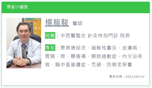在生活壓力大、3C產品使用需求大增的現代社會,辦公族、低頭族……受苦於「肩頸僵硬」的民眾越來越多,楊龍駿醫師提醒,長時間維持同樣姿勢,肌肉缺少活動的機會,自然就會導致肌肉僵硬。而局部僵硬的肌肉未及時處理,緊繃的情形可能沿著整條肌肉向全身上下蔓延,引發不同的症狀,肩頸僵硬酸痛是最常見的,往上延伸往往會造成睡眠障礙、頭暈、頭痛等症狀,往下也常導致背、腰部甚至下肢的酸脹痛。。然而,由於西醫科別分類較細,尤其在肌肉骨骼方面,更有可能會因專注在控制局部症狀,導致找不出病源,變成「頭痛醫頭、腳痛醫腳」,不僅治療效果有限,症狀也隨時有可能再復發。