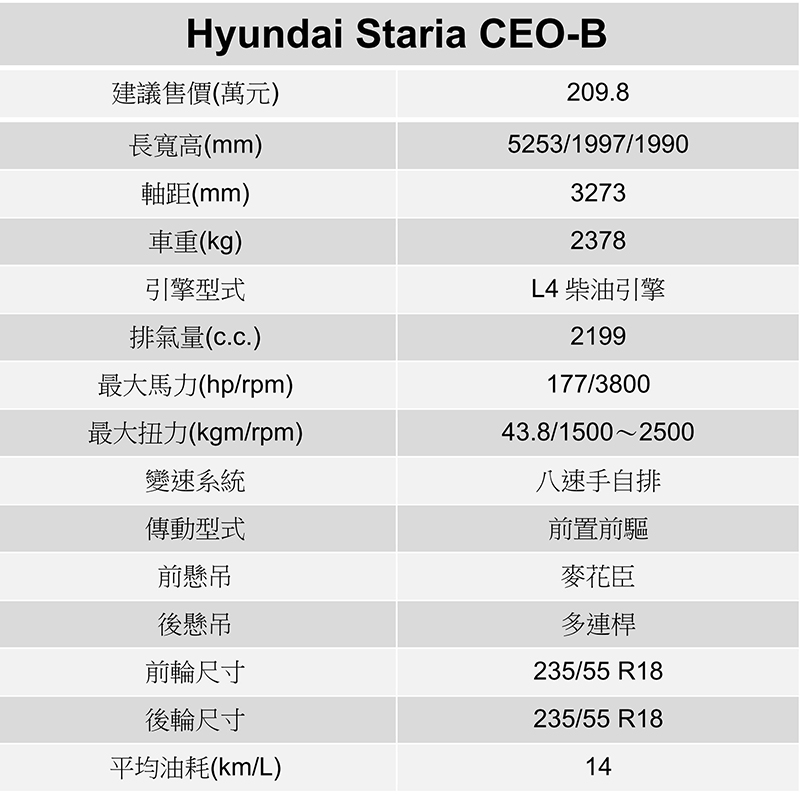 Staria不僅加速輕盈,面對不平路面也能快速消弭震動起伏維持穩定,並轉換成有質感的舒適感受。 Staria在車型編制方面規劃兩款九人座、一款八人座與兩款七人座,其中更為實用的九人座車型獲得許多旅行業與企業青睞,而此次試駕的CEO七人座車型所配置的第二排商務座椅,則能從商旅跨足至自用MPV市場,然而就以MPV角度來看,Staria不論硬體或配備甚至舒適度都擁有高水準的表現。