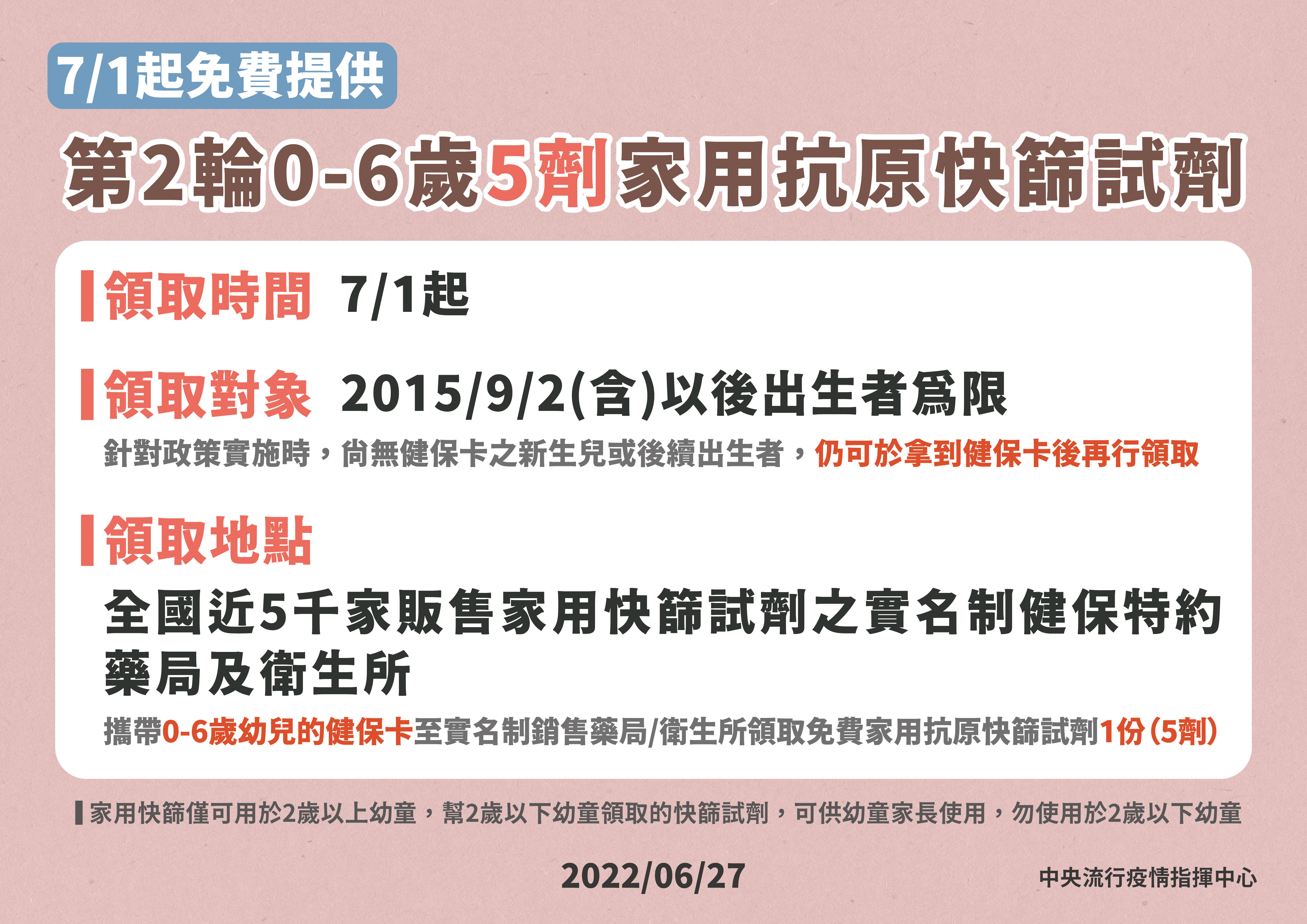 發言人莊人祥宣布,因應滿6個月至5歲幼兒COVID-19疫苗施打作業尚未進行,為保護幼兒健康,自今(2022)年7月1日起,將免費提供第二輪5劑家用抗原快篩試劑給學齡前幼兒(0至6歲),民眾可持2015年9月2日(含)以後出生的學齡前孩童健保卡,至各快篩實名制販售據點再免費領取一份5劑家用快篩試劑。