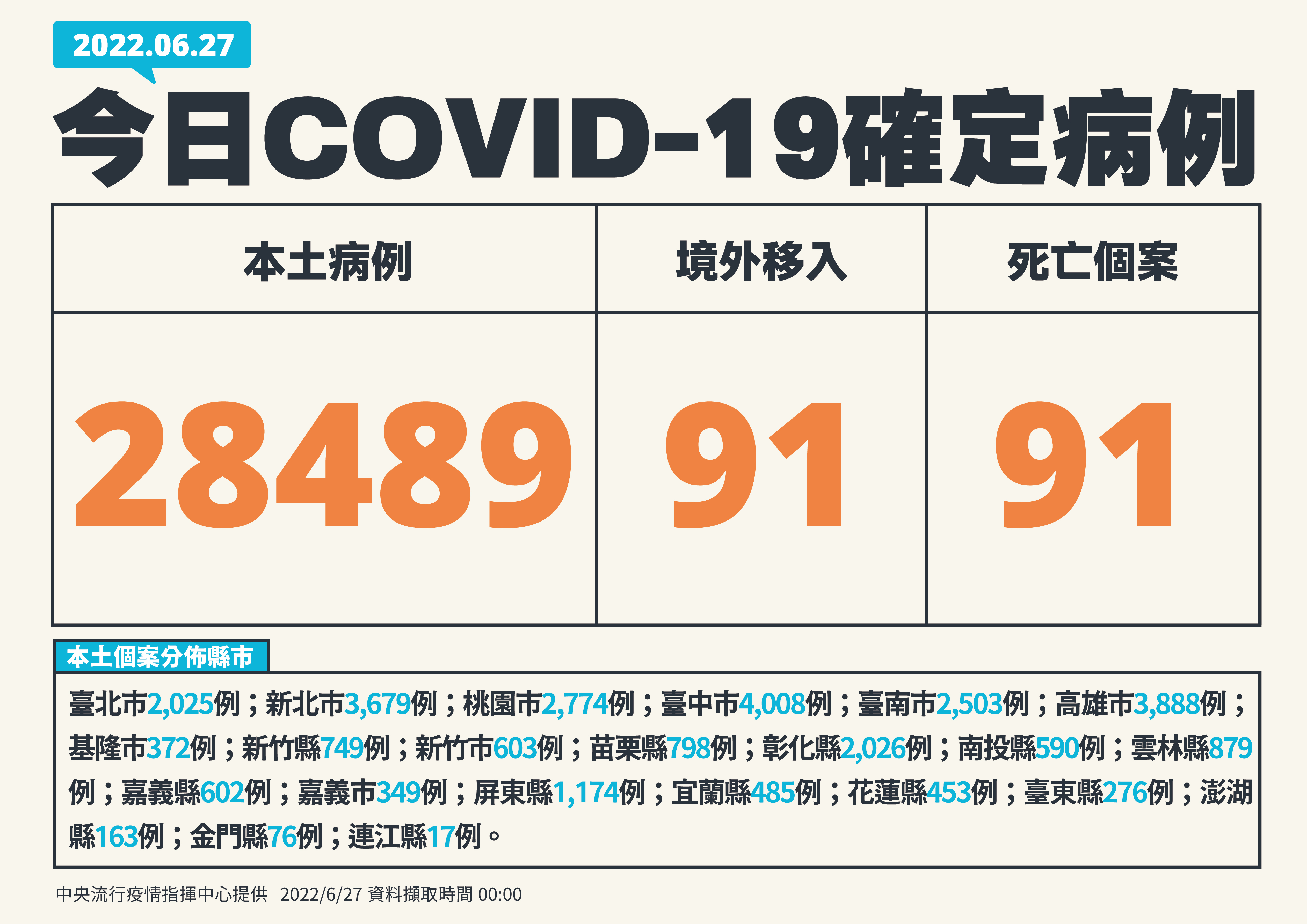 【健康醫療網/記者林哲遠報導】中央流行疫情指揮中心今(27)日公布國內新增28,580例COVID-19確定病例,分別為28,489例本土個案及91例境外移入;另確診個案中新增91例死亡。