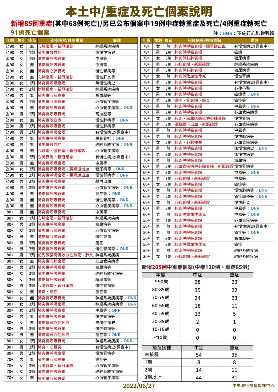 指揮中心指出,今日新增91例本土病例死亡個案,為57例男性、34例女性,年齡介於30多歲至90多歲以上,皆屬重度感染個案、86例具慢性病史、59例未接種3劑 COVID-19疫苗。確診日介於今(2022)年5月11日至6月24日,死亡日期介於5月11日至6月24日。