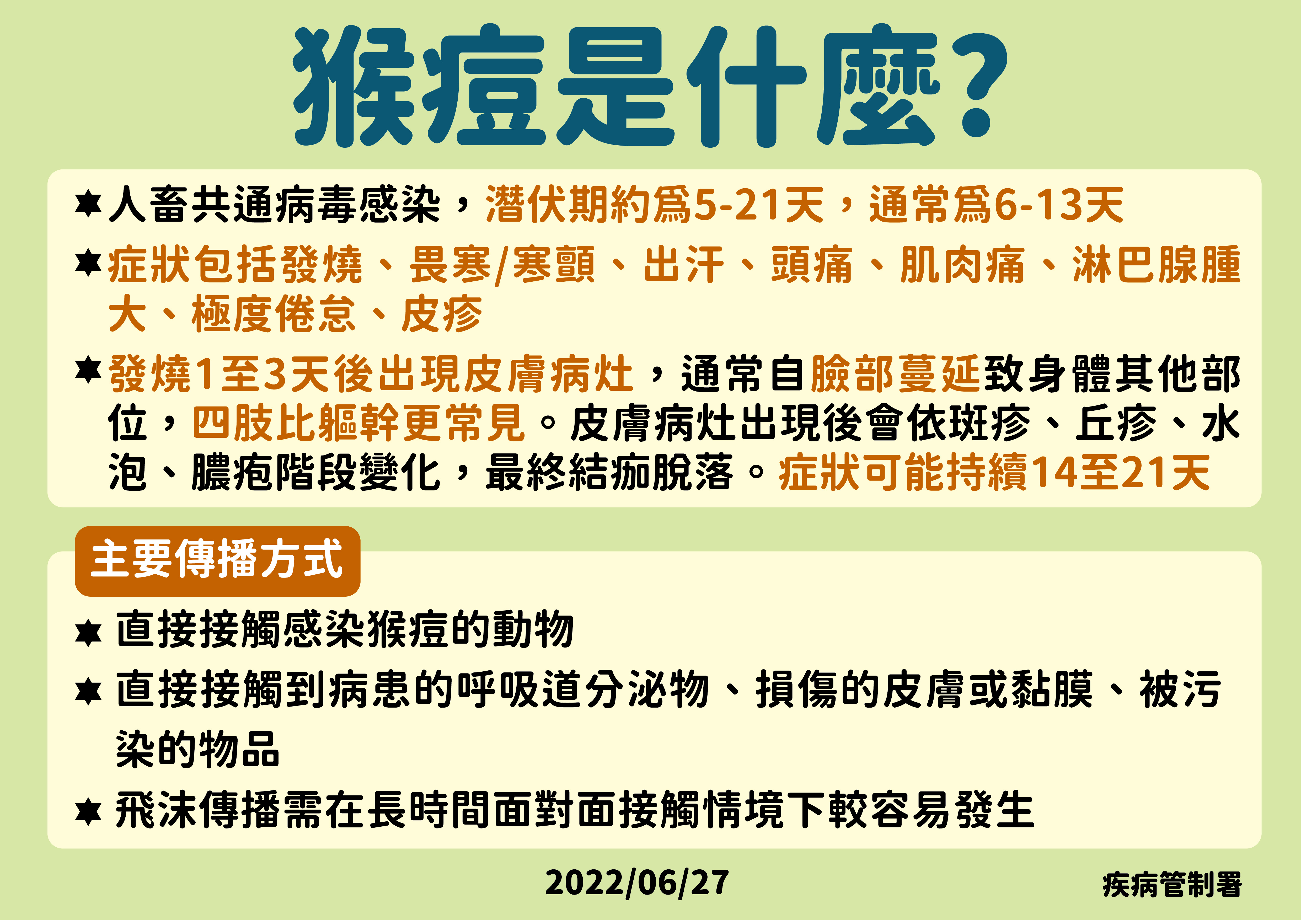 陳婉青說明,猴痘為人畜共通病毒感染,潛伏期約為5到21天,通常為6到13天,其症狀包含發燒、畏寒/寒顫、出汗、頭痛、肌肉痛、淋巴腺腫大、極度倦怠、皮疹等;發燒1至3天後會出現皮膚病灶,通常自臉部蔓延致身體其他部位,四肢比軀幹更常見。皮膚病灶出現後會依班疹、丘疹、水泡、疱段變化,最終結痂脫落,整體症狀可能持續14至21天。