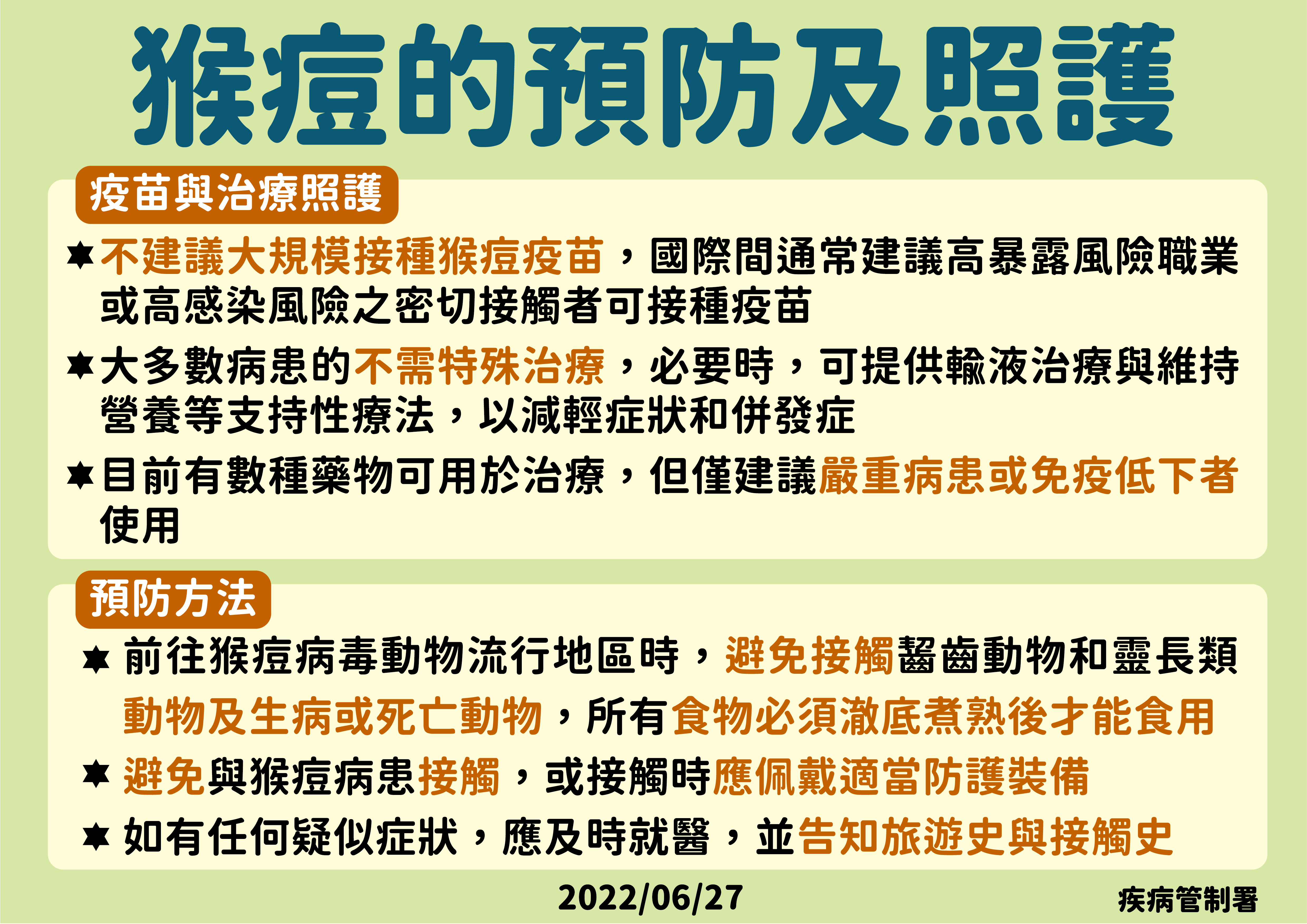 此外,發言人莊人祥也補充,目前指揮中心正在與藥商做相關疫苗的採購議程,主要會採購第三代天花疫苗。國內有儲備「第一代」疫苗為戰備用途,但副作用較多,暫不考慮使用,第三代疫苗則會直接拿來使用,優先施打包含照顧猴痘患者的醫護人員、實驗室人員及短時間內與個案有密切接觸者。