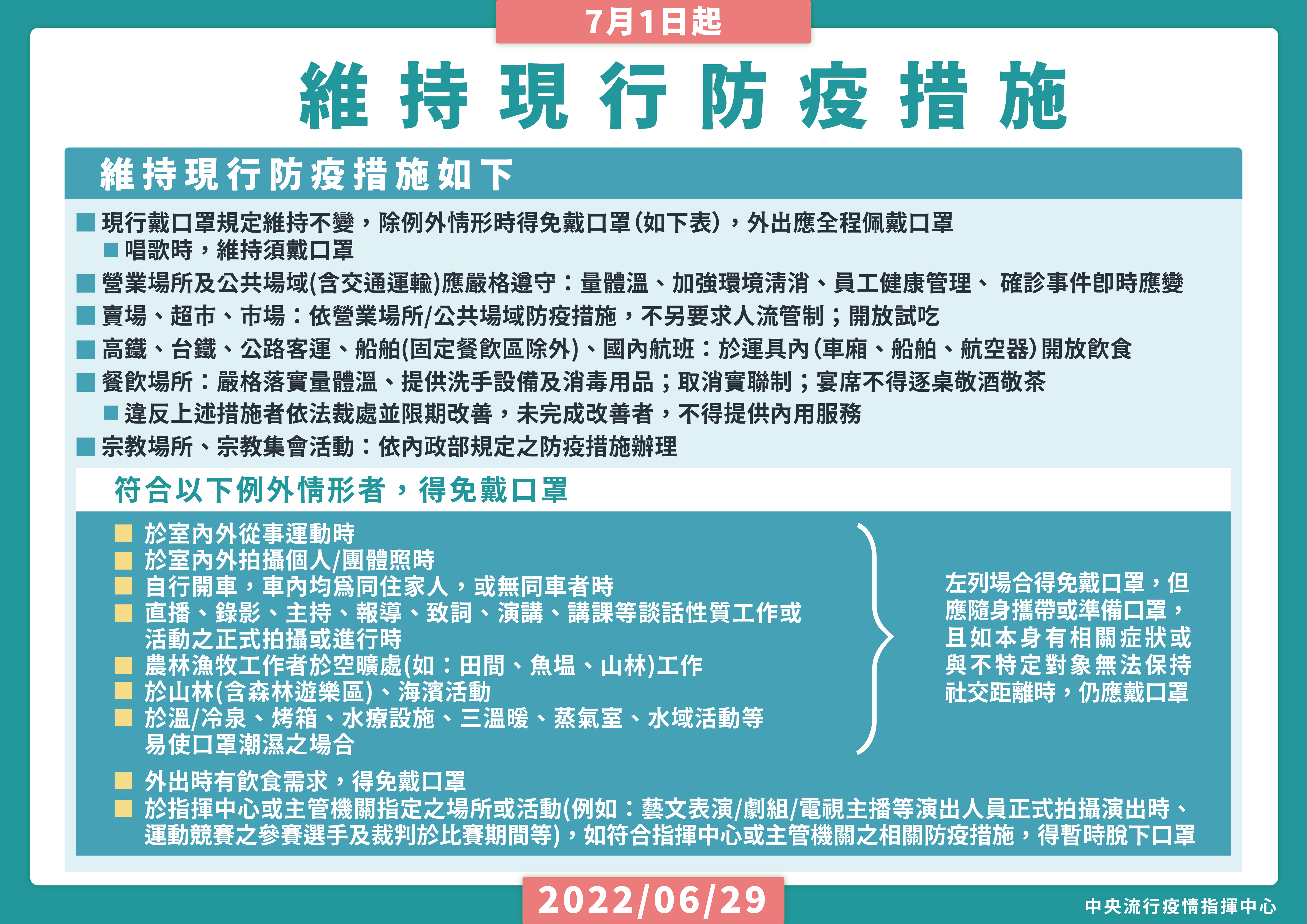 指揮官陳時中宣布,考量全臺已進入大規模流行階段,且境外移入BA.4及BA.5病例數持續增加,為兼顧防疫、經濟及社會運作,維持國內防疫量能與有效控管風險,經綜合評估疫情情勢,7月1日起維持現行戴口罩等防疫措施,相關規定說明如下: