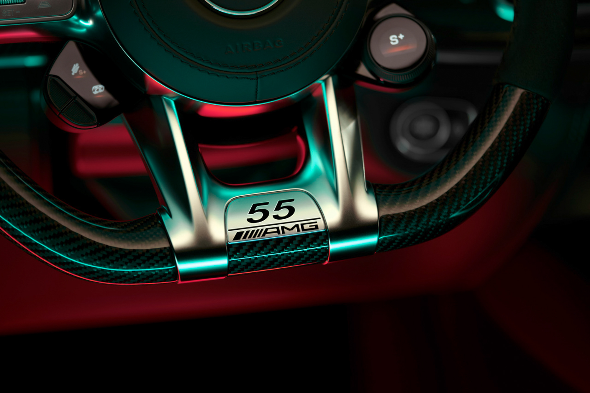 內裝, 則採用紅黑搭配,門檻飾板標有 AMG 字樣附 紅色照明、縫上紅色 "Edition 55" 字樣及紅色縫線的高品質絲絨AMG 踏墊,以及 AMG 紅黑雙色 Nappa 真皮座椅,除此之外還裝配 AMG 高性能 DINAMICA 平底跑車方向盤(含AMG 55 銘牌)與刻畫 AMG 廠徽印記的中央扶手。即刻下訂,附贈 "Edition 55" 訂製法蘭絨抗靜電室內車罩。