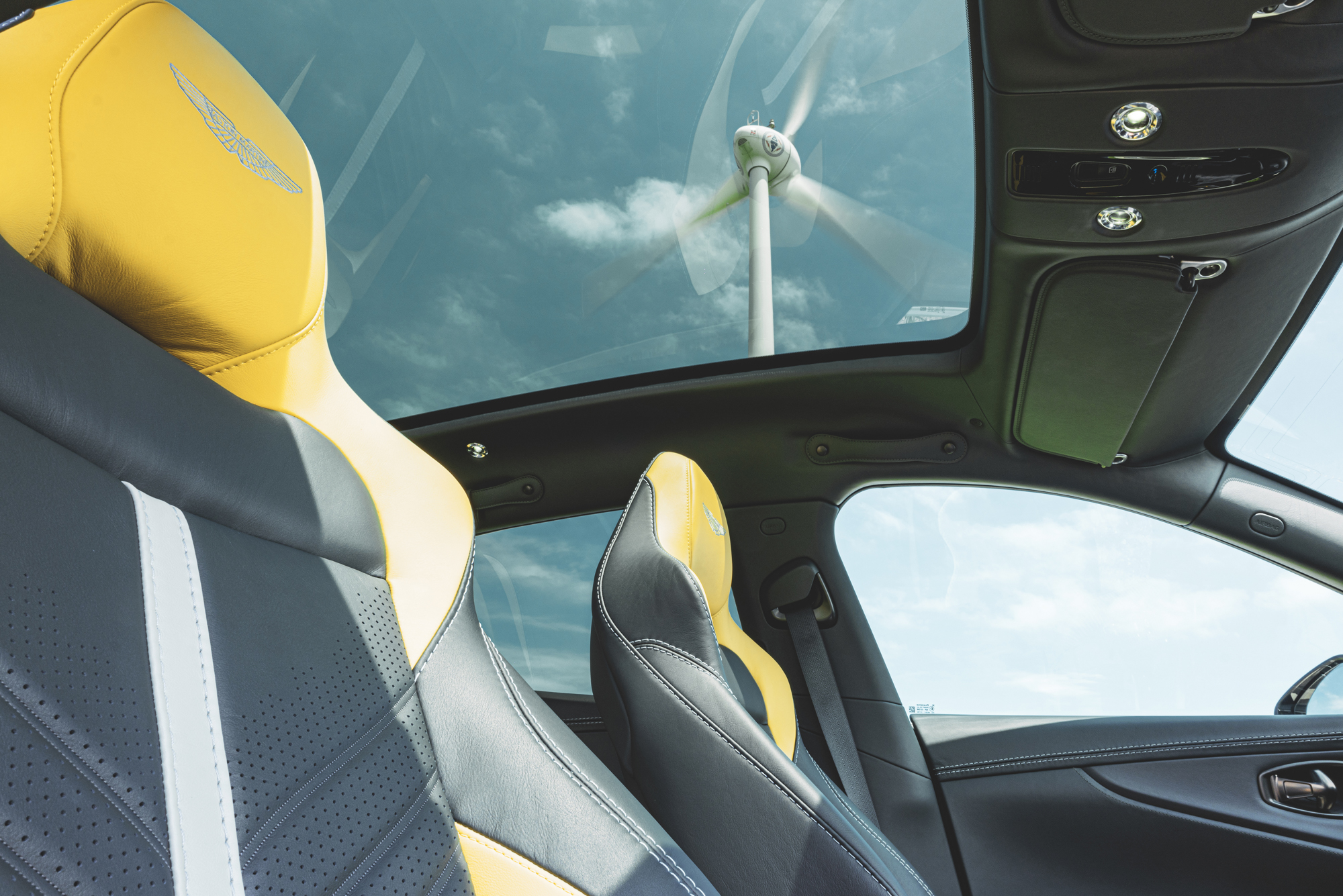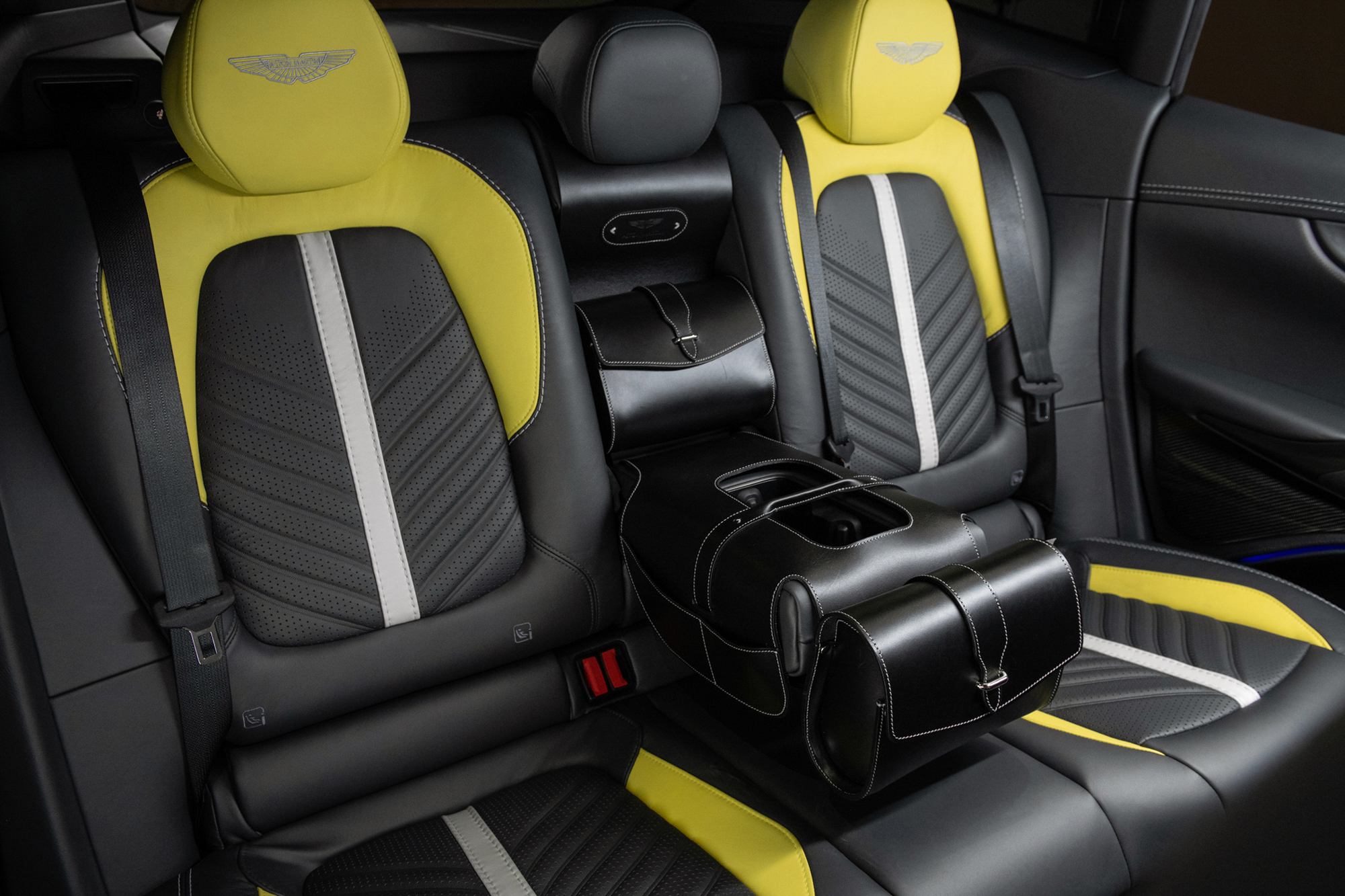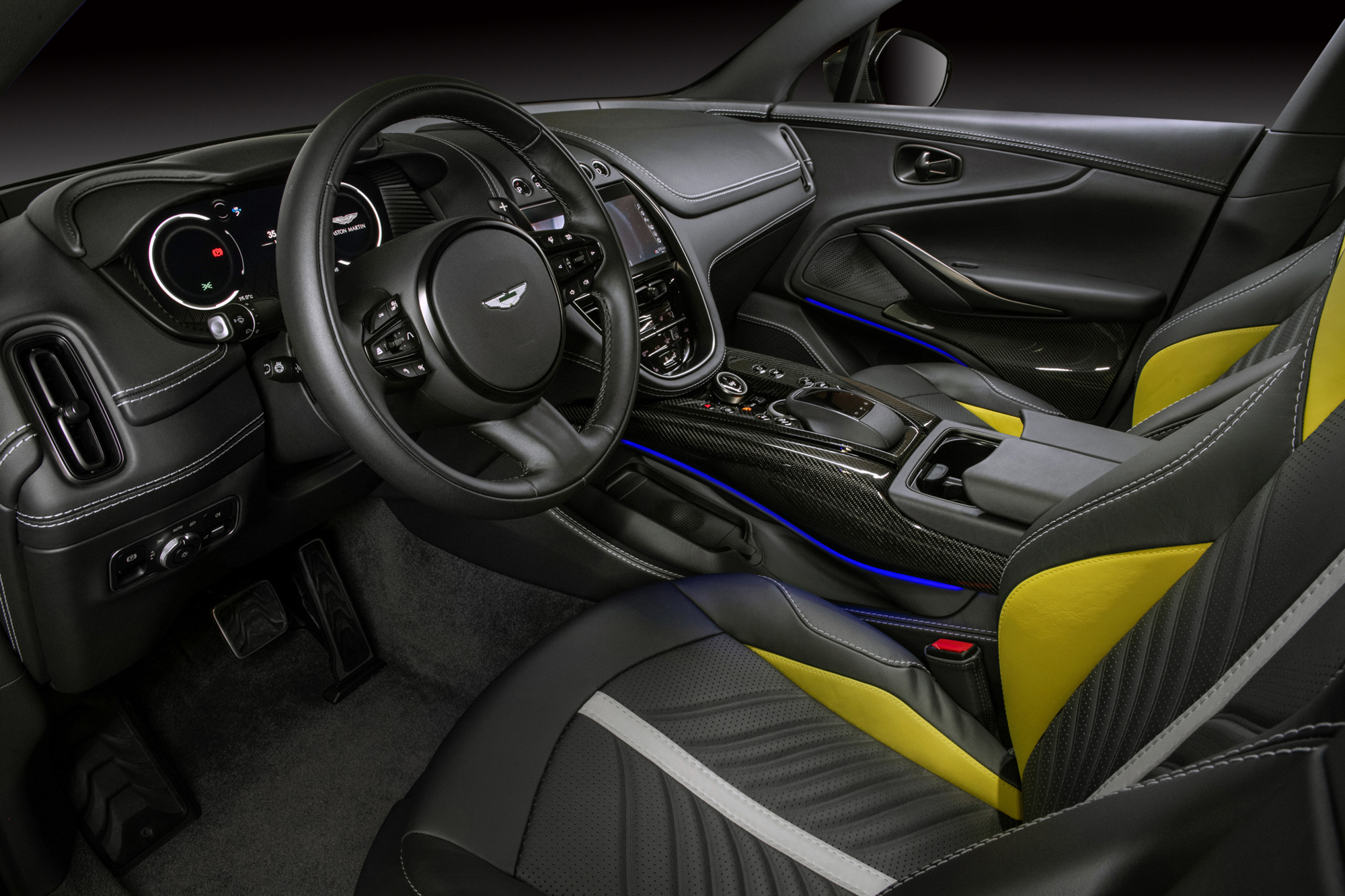 車室空間則選用雙色頂級真皮內裝,以 Titanium Grey 鈦灰綠與 Electron Yellow 電流黃配色與外觀風格相互呼應,搭配擁有座椅頭枕 Aston Martin Logo 繡線徽飾、飛翼繡紋與座椅網孔的運動化升級座椅,附有電動座椅十六向調整及前後座電熱座椅功能;中控飾板選用交織斜紋碳纖維材質。