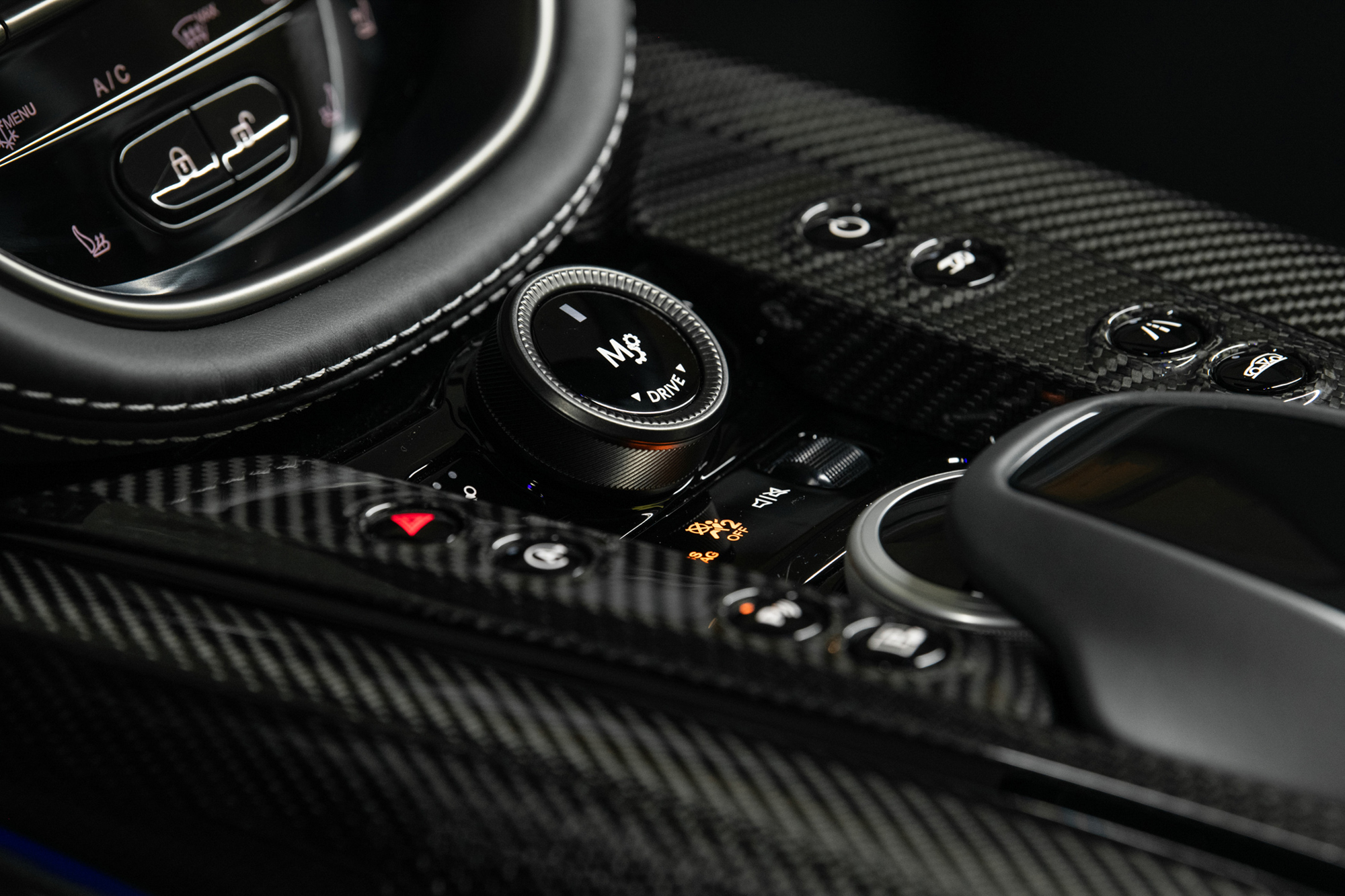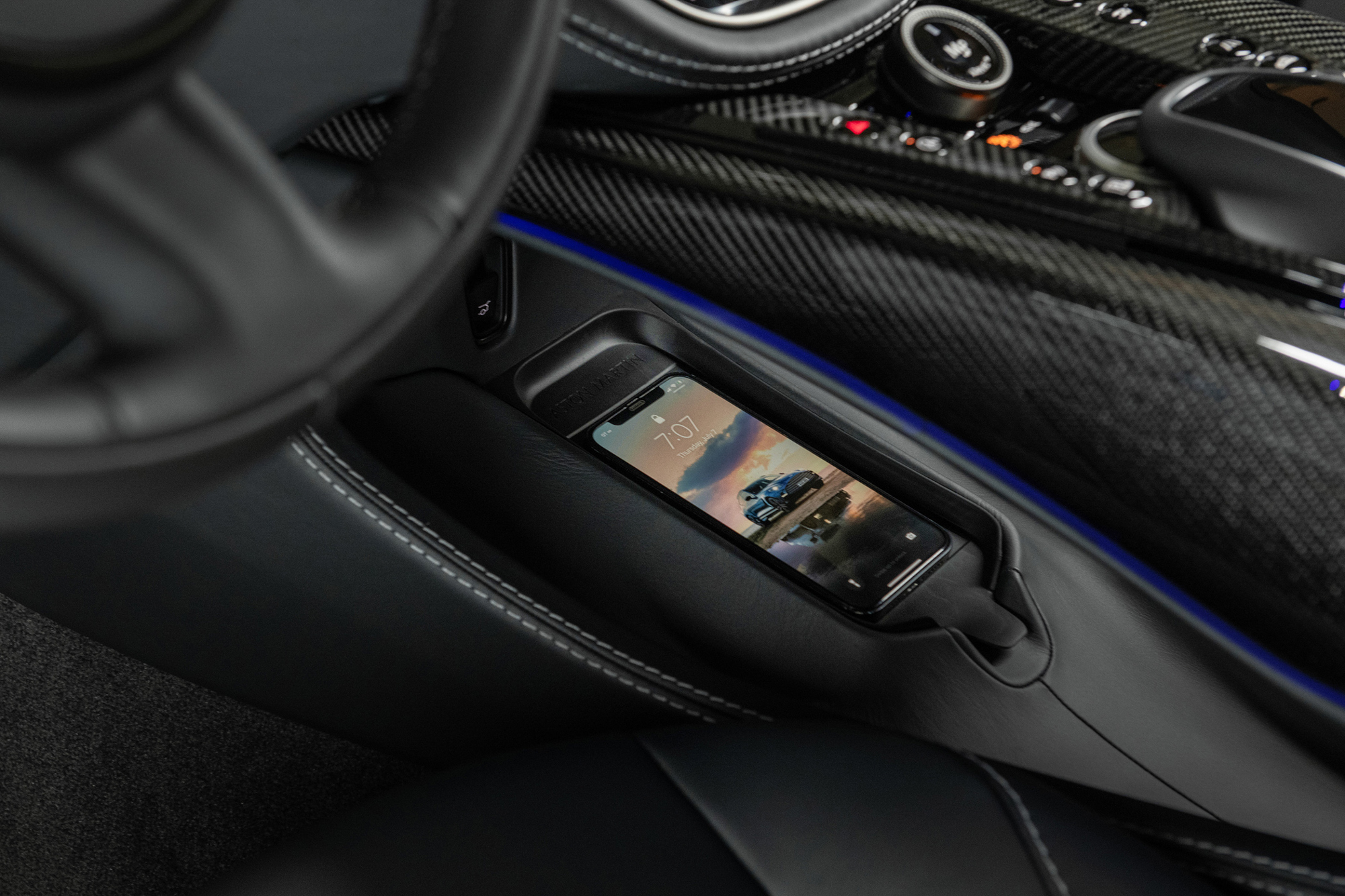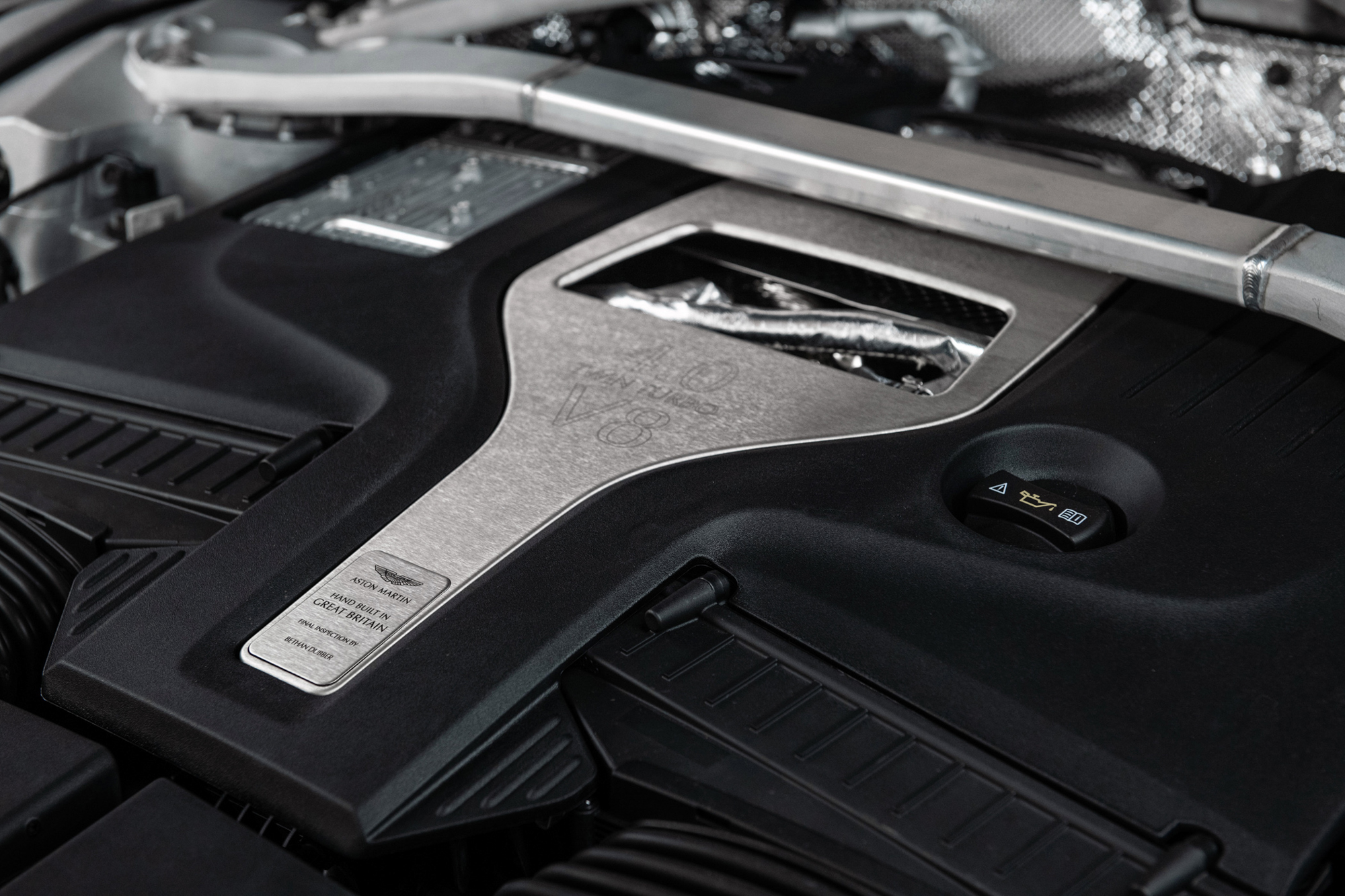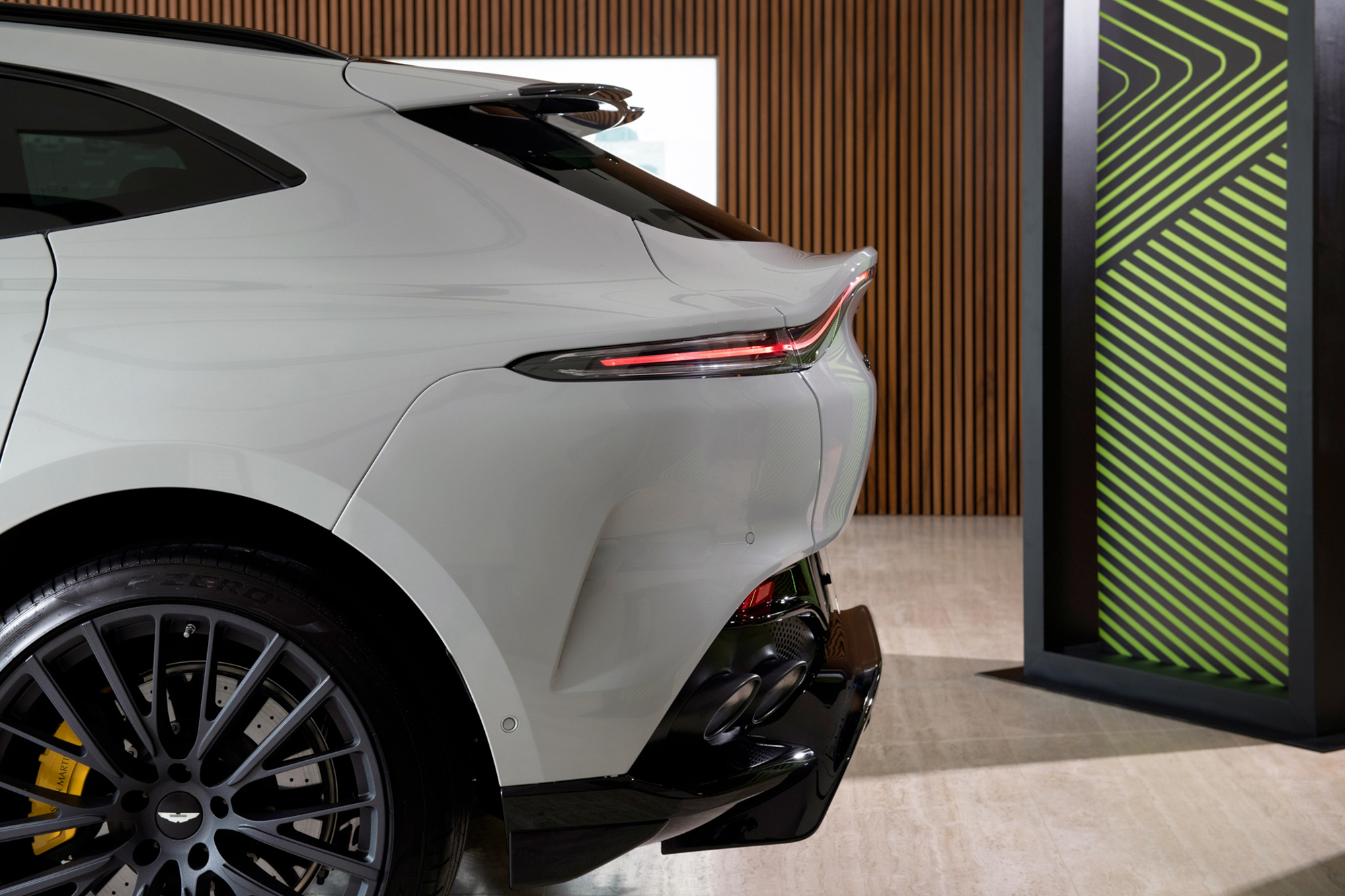 車室空間則選用雙色頂級真皮內裝,以 Titanium Grey 鈦灰綠與 Electron Yellow 電流黃配色與外觀風格相互呼應,搭配擁有座椅頭枕 Aston Martin Logo 繡線徽飾、飛翼繡紋與座椅網孔的運動化升級座椅,附有電動座椅十六向調整及前後座電熱座椅功能;中控飾板選用交織斜紋碳纖維材質。