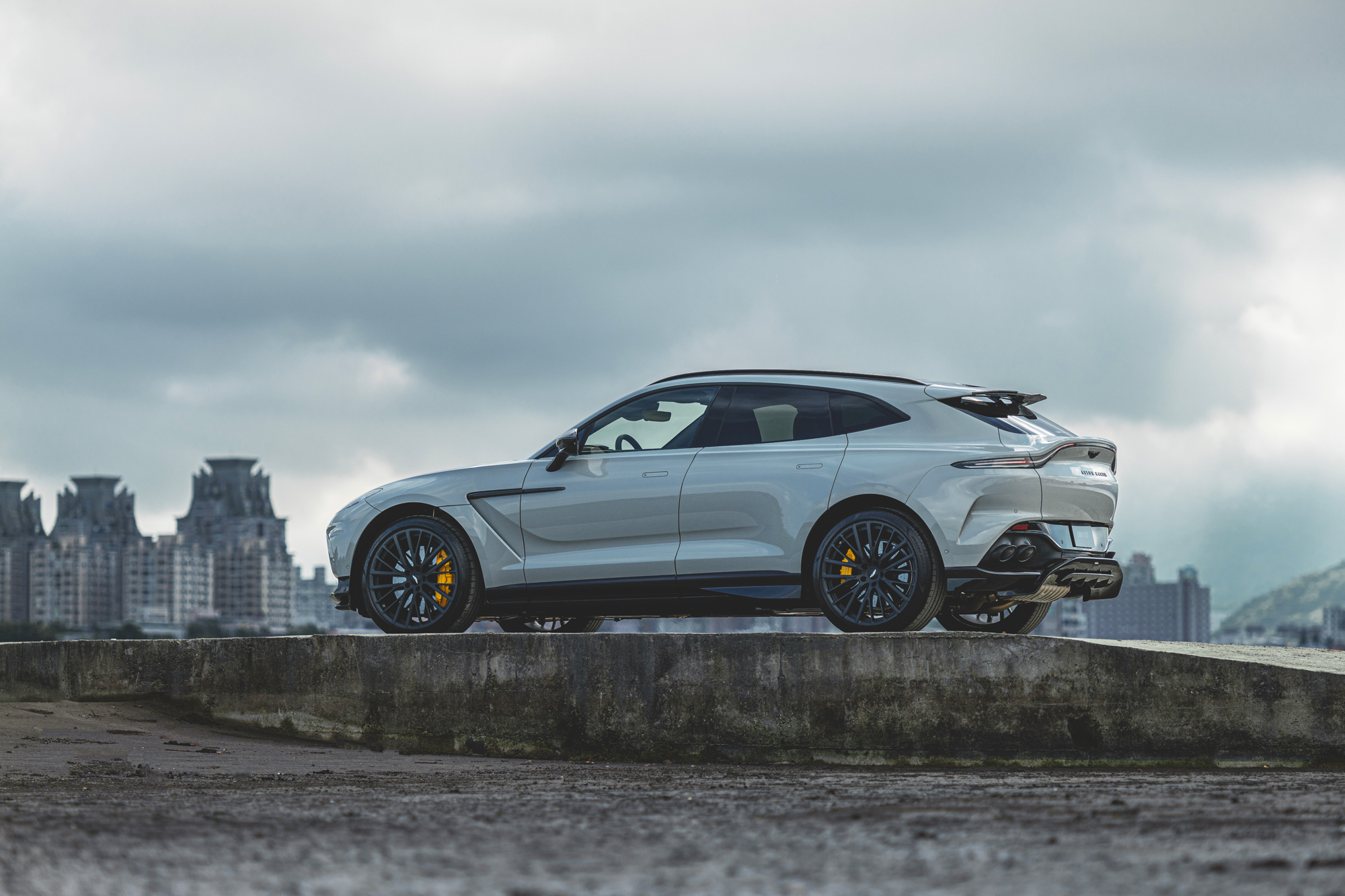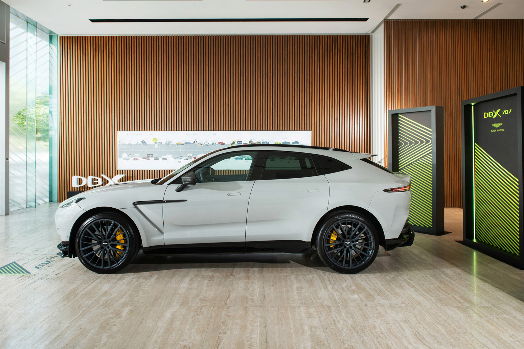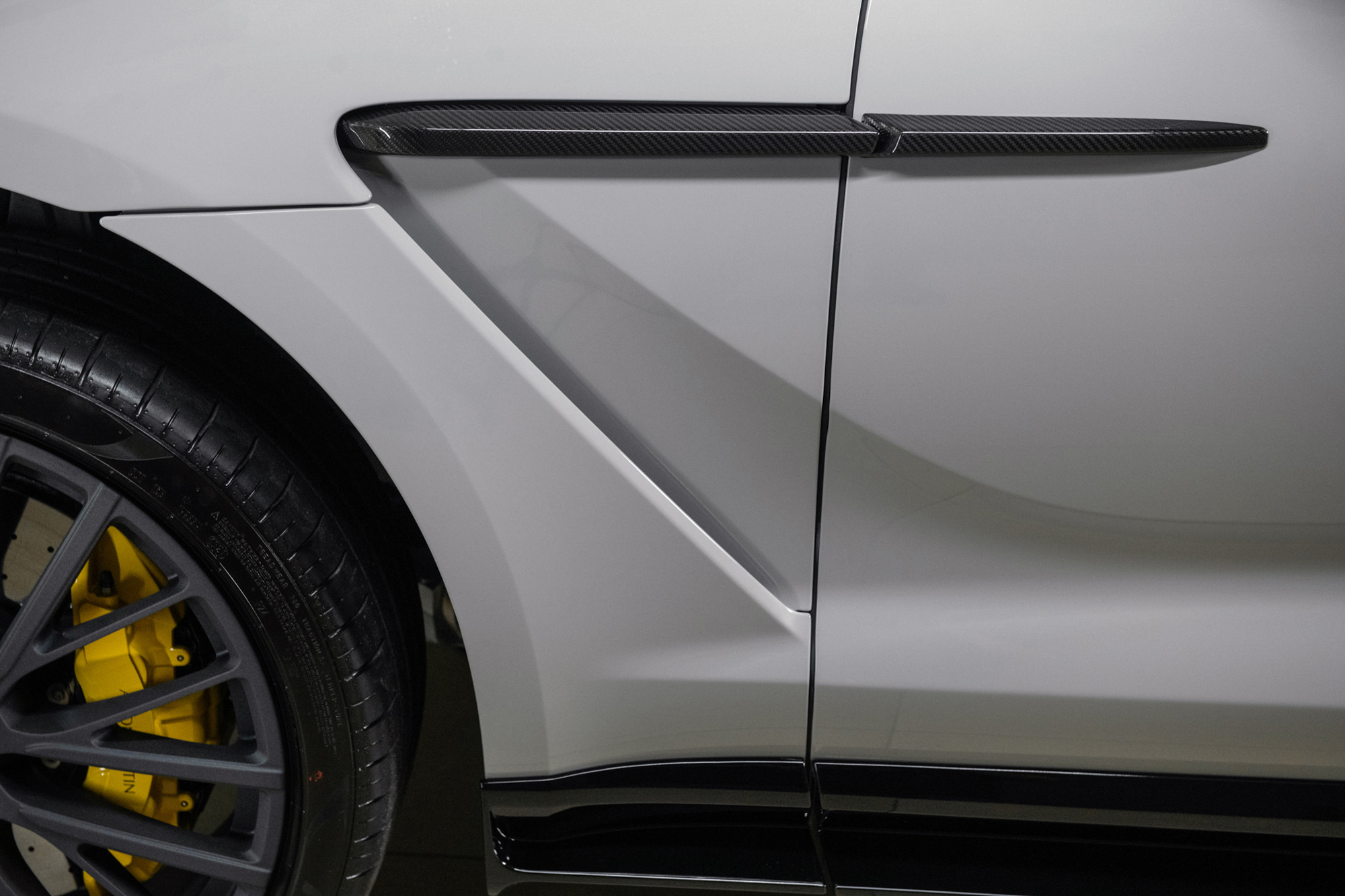 DBX707 台灣首發車輛以 Apex Grey 賽道灰為漆色主調,選用碳纖維上層外觀套件,側進氣飾條、後視鏡蓋與引擎蓋散熱網分流鰭以碳纖維材質,搭配 23 吋黑砂面鍛造輪圈及燻黑色透明尾燈,並以黃色剎車卡鉗為車身視覺焦點。