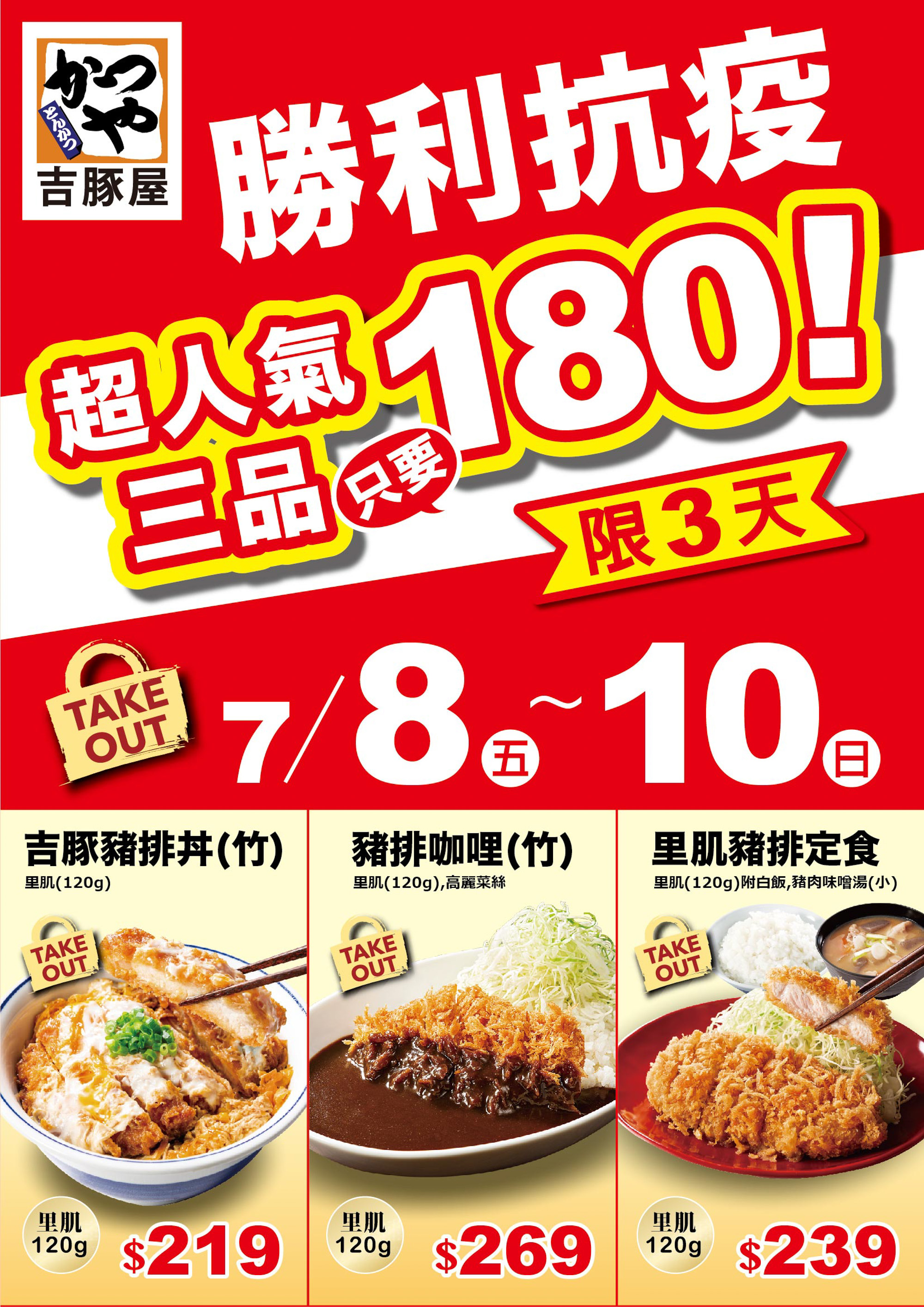 吉豚屋特別選在分科測驗前最後一個週末,7/8-7/10 推出人氣勝利三品優惠活動,包含吉豚豬排丼(竹)、豬排咖哩(竹)、里肌豬排定食均一特價 180 元。此外,先前舉辦職業駕駛元氣應援活動廣受好評,吉豚屋決定延長優惠,凡本人持計程車駕駛人執業登記證,或是標示駕照種類為職業小型車的駕照,至吉豚屋家樂福重新店、家樂福中華店,點購主餐任一份贈送麥香紅茶一罐,若自備環保杯可再奉上日式無糖健康麥茶,內用加碼任點主餐一份即享免費續加白飯,以及免費停車 2 小時兌換券。