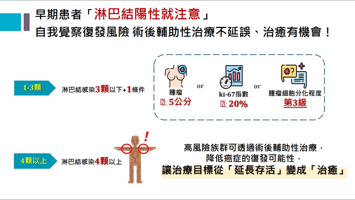 術後輔助性治療以往透過化療或荷爾蒙治療進行,其風險分別降低16.8%及15-20%。隨著醫藥技術進步飛快,現今高復發風險族群還可搭配細胞週期抑制劑,可有效降低30%以上的復發風險。郭玟伶醫師強調,早期患者檢查後發現「淋巴結陽性」,千萬別延誤術後輔助性治療,才有治癒機會。