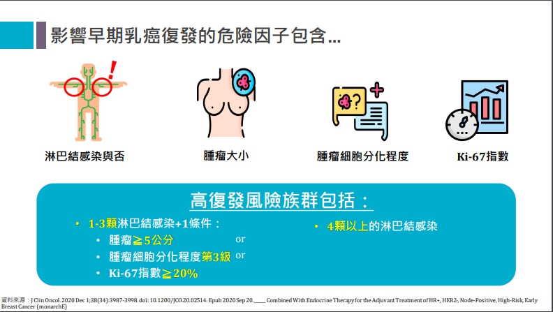曾令民說,影響早期乳癌復發的危險因子包括:淋巴結感染與否、腫瘤大小、腫瘤細胞分化程度及Ki-67指數。